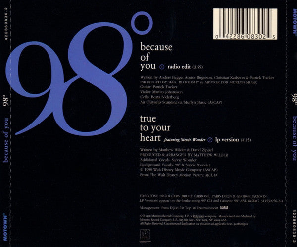 ©℗ 1998 Motown Record Company, L.P., a PolyGram Company. Manufactured and Marketed by Motown Record Company, L.P., New York, NY.-USA Track 1: Produced for Murlyn Music Air Chrysalis Scandinavia / Murlyn Music (ASCAP) Track 2: © 1998 Walt Disney Music Company (ASCAP) From the Walt Disney Motion Picture "Mulan" LP Versions appear on the forthcoming 98° CD and Cassette "98° And Rising" 314530956-2/4 Management: for Top 40 Entertainment