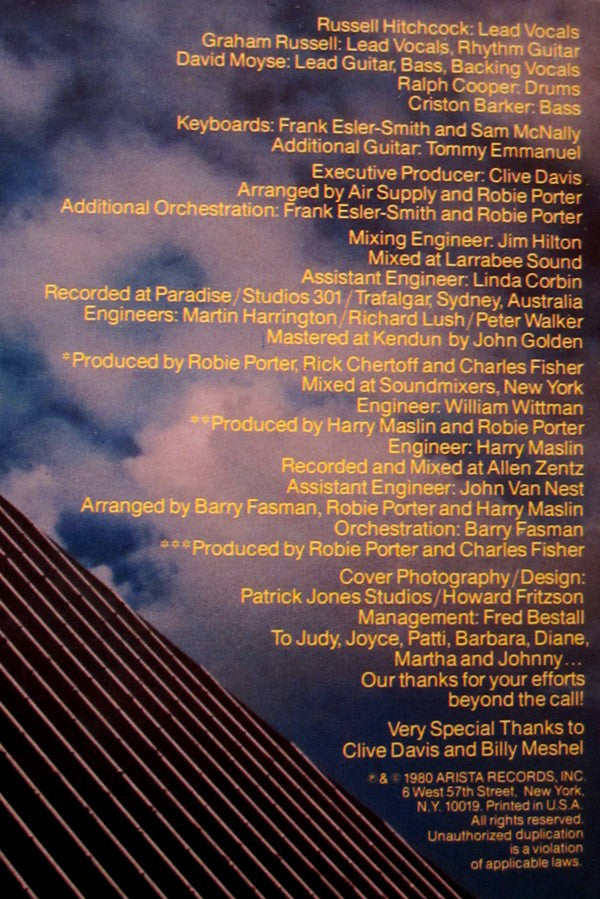 Mixed at Larrabee Sound. "Lost In Love" mixed at Soundmixers, New York. "Every Woman In The World" and "American Hearts" recorded and mixed at Allen Zentz. Recorded at Paradise/Studios 301/Trafalgar, Sydney, Australia. Mastered at Kendun. All songs © 1980 Arista Music, Inc., (ASCAP)/BRM Publishing (ASCAP)/Riva Music Ltd/(PRS) except † which is © 1980 BRM Published c/o Arista Music, Inc. (ASCAP) and except ** which is © 1980 Pendulum Music Ltd./Unichappell Music, Inc.