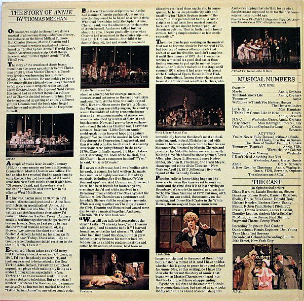 © 1977 CBS Inc. / ℗ 1977 CBS Inc. / Manufactured by Columbia Records / CBS Inc. / New York, N.Y. The selections are ASCAP., Recorded at Columbia Recording Studios, 30th Street, New York City. Credits for stage production as listed on back of sleeve: Mike Nichols Presents Annie Produced by Irwin Meyer, Stephen R. Friedman, Lewis Allen Settings by David Mitchell Costumes by Theoni V. Aldredge Lighting by Judy Rasmuson Production Stage Manager Janet Beroza Musical Numbers Choreographed By Peter Gennaro Entire Production Directed By Martin Charnin Based on Little Orphan Annie, (R) by Permission of Chicago Tribune-New York New Syndicate, Inc. Produced by John F. Kennedy Center For The Performing Arts, Alvin Nederlander Associates, Inc., Icarus Productions Produced in Association with Peter Crane Originally Produced by the Goodspeed Opera House Michael P. Price, Executive Producer Cat# 34712 and Andrea McArdle appear on sleeve, JS 34712 and Andrea Mc Ardle appear on labels. This Stereo / Quadraphonic disc is fully compatible with every audio system-stereo or four-channel-with no need to change stylus or cartridge. Played on SQ Quadraphonic systems, it will provide a new and captivating musical experience. In Europe was sold quadro LP, which is erased by black marker and CBS stickered to avoid Columbia logo.