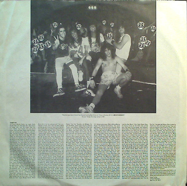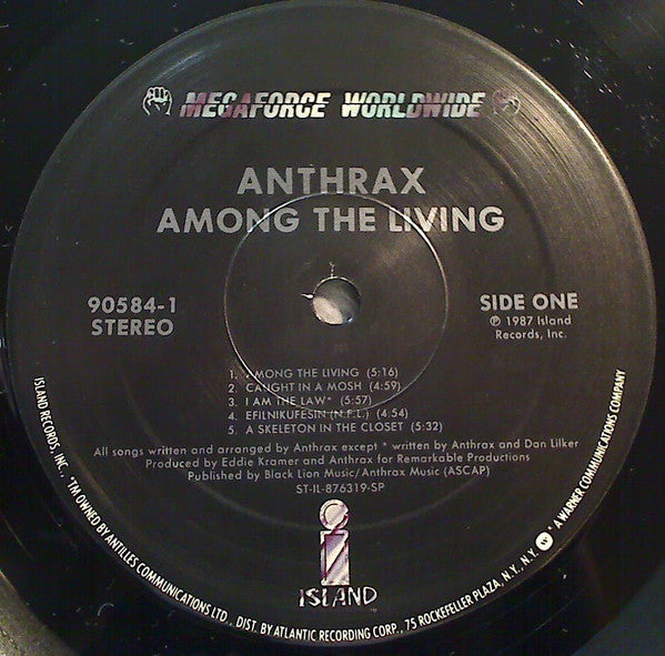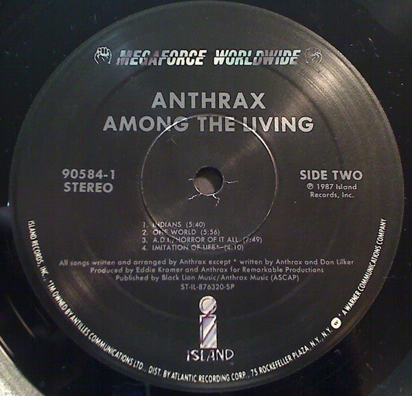 Includes lyric/thank you list inner sleeve plus Anthrax merchandise insert. Direct Metal Mastering. [Rear sleeve: Basic tracks recorded at Quadradial Studios, Miami, Flordia Mixed at Compass Point Studio, Nassau, Bahamas Mastered at Sterling Sound, NYC [... Island Records, Inc. Distributed by ATCO Records, division of Atlantic Recording Corporation [Warner 'W' logo A Warner Communications Company, 75 Rockefeller Plaza, New York, New York 10019 ℗© 1987 Island Records, Inc. All rights reserved. *TM Owned by Island Entertainment Group, Inc. Printed in U.S.A. [Inner sleeve: All songs written and arranged by Anthrax except [A3, B4 written by Anthrax and Dan Lilker. All lyrics © 1986 Black Lion Music/Anthrax Music (ASCAP). [Labels: Published by Black Lion Music/Anthrax Muisc (ASCAP) ℗ 1987 Island Records, Inc.