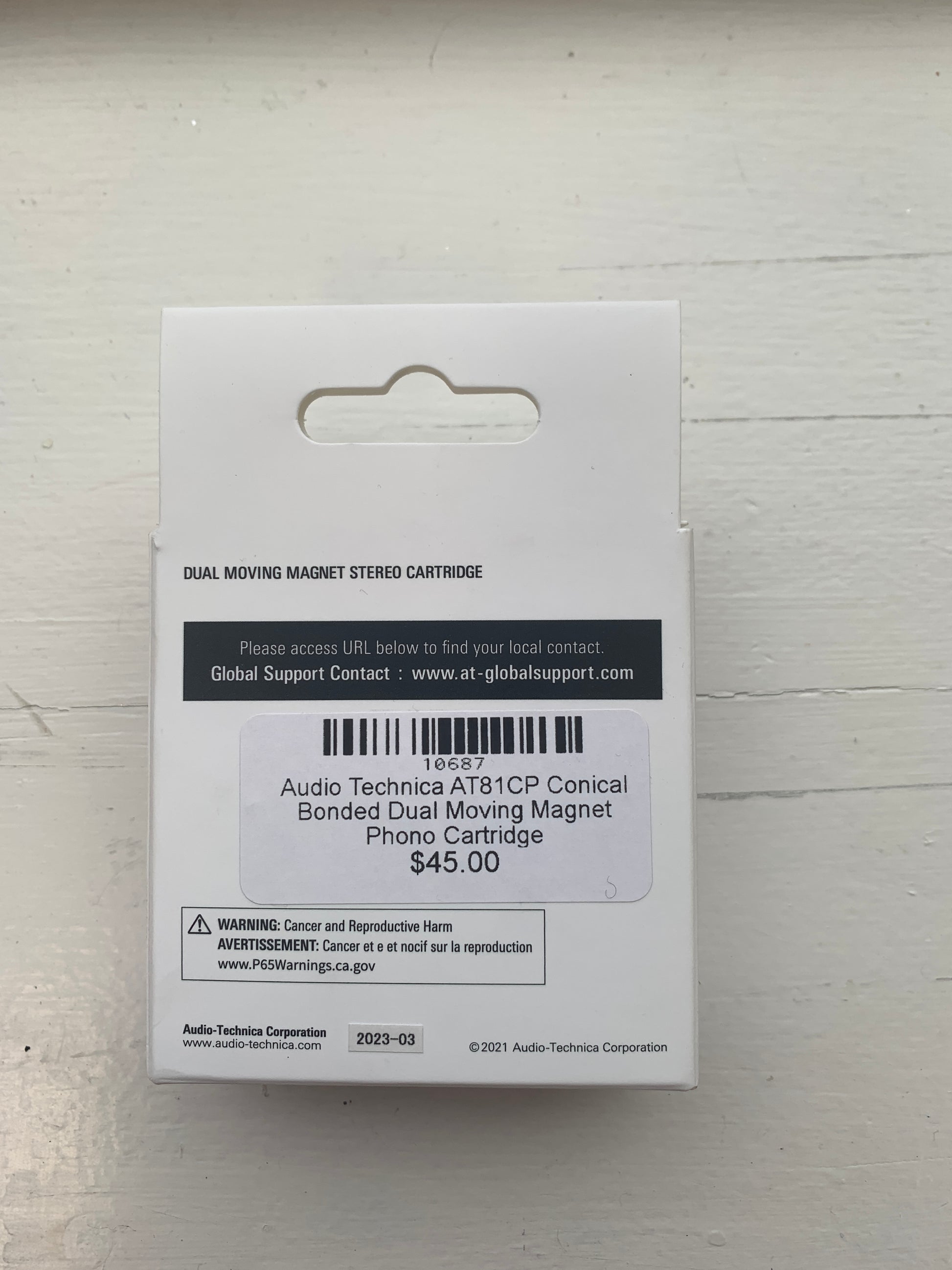 The Audio Technica AT81CP is a P-mount conical cartridge with a frequency response of 20-20,000 Hz. Its key specifications include an output of 3.5 mV, a recommended vertical tracking force of 1.0-1.5 g (1.25 g standard), and a weight of 6.0 g. It features a 0.6 mil conical bonded stylus and a carbon fiber-reinforced ABS cantilever.