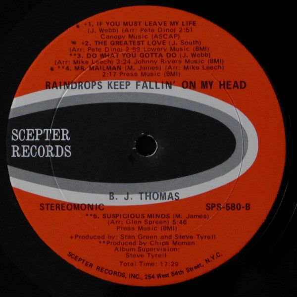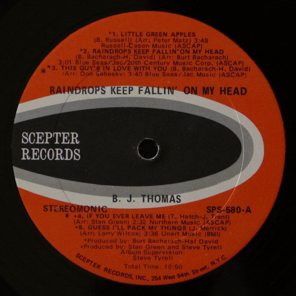 US Unipak edition, Keel pressing with burnt orange background labels (rather than red) Compared to other Keel pressing ( [r4842461 ), label text is less condensed/less bold. Album title takes approximately 80% of the left-right space (other pressings have title quite condensed). Album title is above centre hole but below those song titles that are also above the centre hole Side A has 3 titles above centre hole, side B 4 titles. Side B has Sterling mastering stamp Cover notes: "Stereo-Monic" "This record provides both Stereophonic and Monophonic sound reproduction" Gatefold picture sleeve "Raindrops Keep Fallin' On My Head" from the Motion Picture "Butch Cassidy And The Sundance Kid".