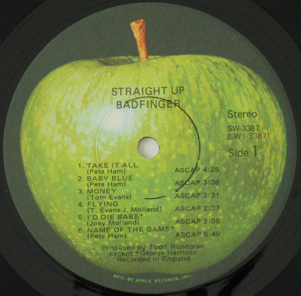 "Winchester rifle" (─◁) symbol etched in runouts denotes Capitol Records Pressing Plant, Winchester, pressing. Label variation to another Winchester pressing [r=4984927, otherwise identical to labels on Los Angeles pressing [r=1823347. First cat. # on labels Second cat. # on jacket spine Track A5 title on jacket: "I'd Die, Babe" Recorded in England "All songs written by Badfinger" appears on back of sleeve, labels credit specific artist(s).