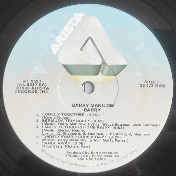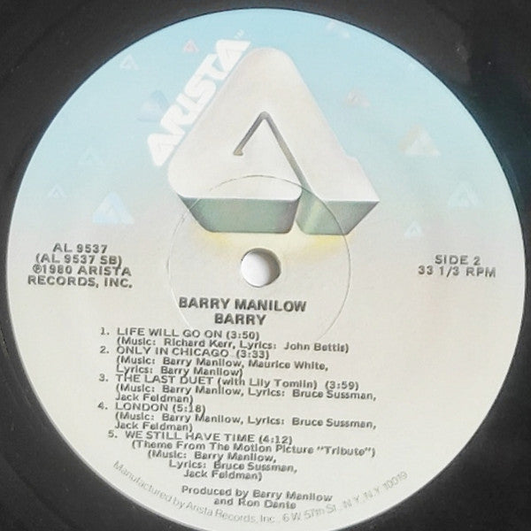 Label variation. "We Still Have Time" Theme From The Motion Picture "Tribute" With printed inner sleeve, also including a pre-printed, pre-addressed envelope that could be used to become a member of the Barry Manilow fan club [see image section. Very close to [r11646067 but this version doesn't have a sticker and the disc labels are a bit different : - The printing on the left AL 9537 (AL9537 SA) ℗1980 Arista Records, INC and right Side 1 33 1/3 RPM is all on the same bold font and narrower than the other release.
