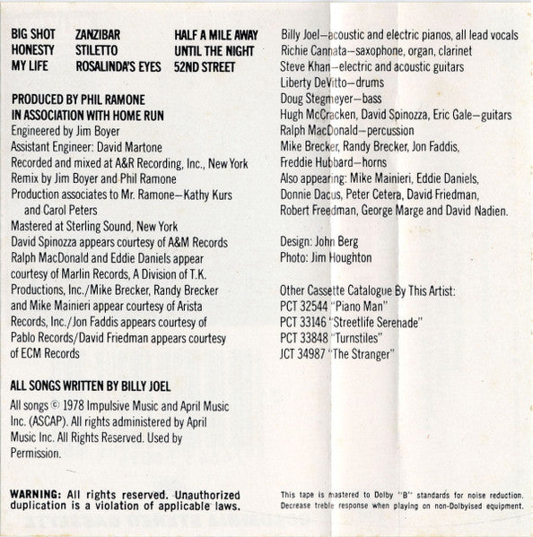 ℗ 1978 CBS Inc. © 1978 CBS Inc. Manufactured by Columbia Records / CBS Inc. Produced in association with Home Run Catalogue numbers: J-card: PCT 35609 // Labels: PCT35609 Reissue with PCT catalogue number and triangle in circle symbol on side 1 label. Gray shell with a matte finish, a recessed Oꞌꞌꞌꞌ5ꞌOꞌꞌꞌꞌO tape scale, MADE IN USA (right center, one side), black direct-to-shell labels & fused assembled. The J-card has printing on both sides.