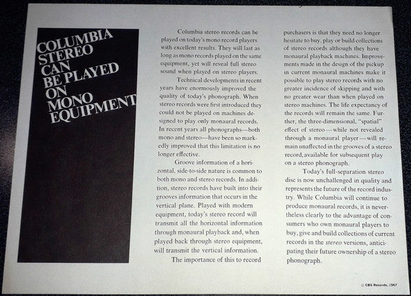 Original Mono Pressing with Red and White Columbia "2-Eye" Labels that have Mono at the bottom. Labels have "B. Dylan" credits, close the last title song, on both sides. Back cover, on bottom right corner, has not the text "(c) 1968 by Bob Dylan". Same copies come with a Columbia advertising insert (see pic).