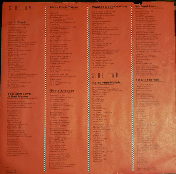 "53" at the beginning of label rim text denotes a [l277410 pressing. "Raise Your Hands", "Wanted Dead or Alive", "Let It Rock", "Social Disease", "Never Say Goodbye", and "Wild in the Streets": Copyright (C) 1986 Bon Jovi Publishing (ASCAP). "You Give Love a Bad Name", "Livin' on a Prayer", "Without Love" and "I'd Die For You": Copyright (C) 1986 Bon Jovi Publishing, April Music, Inc. and Desmobile Music (ASCAP). Recorded at Little Mountain, Vancouver B.C. Pre-production credits: Century Productions Originally mastered at Sterling Sound. ℗ © 1986 PolyGram Records, Inc. Made in USA