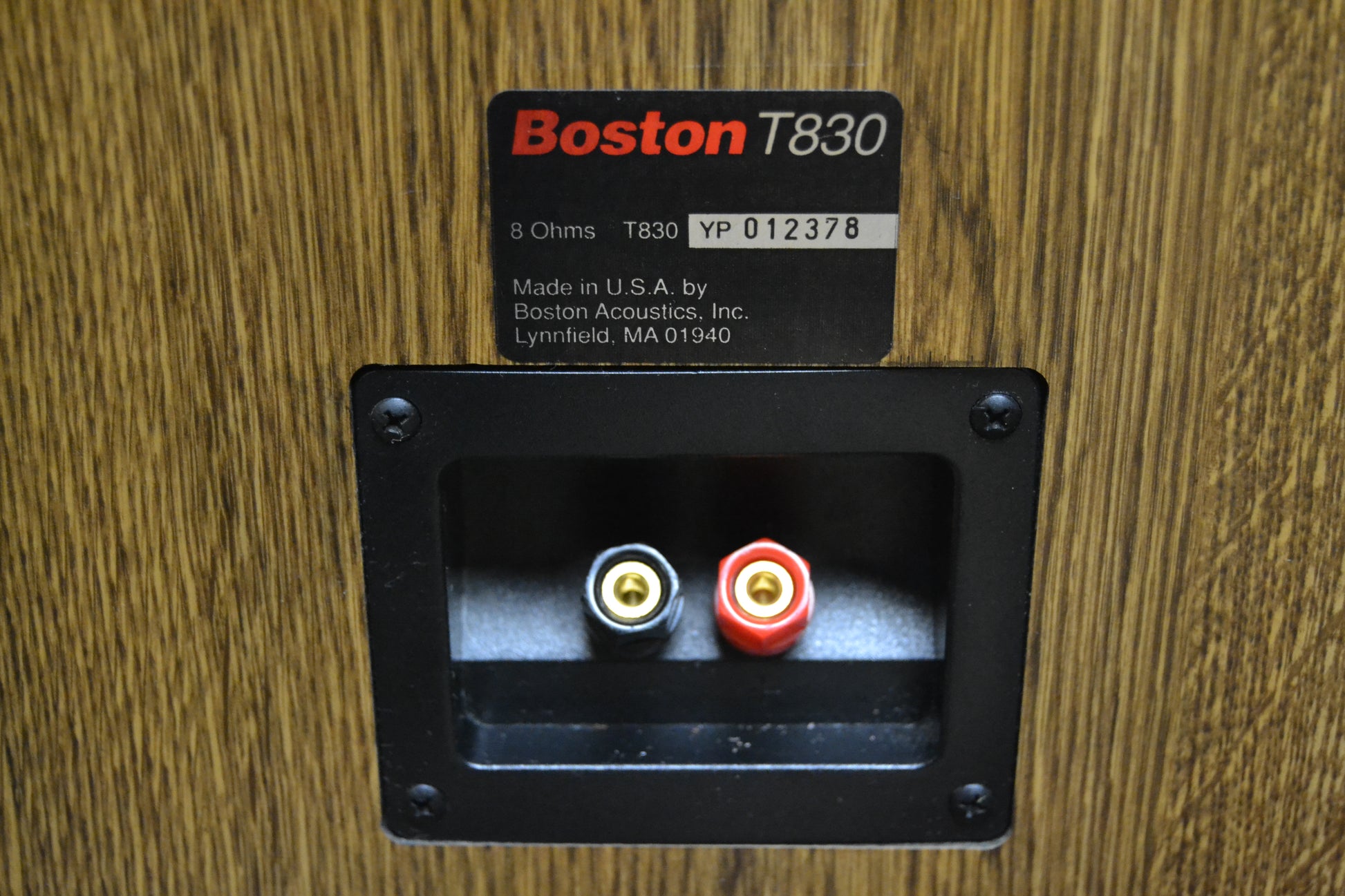 The Boston Acoustics T830 is a 3-way, acoustic suspension tower speaker from the 1990s with an 8-inch woofer, a 3.5-inch midrange, and a 1-inch tweeter. Its specifications include a power handling of 15–100 watts at 8 ohms, a frequency response of \(45Hz20kHz\) (within \(3dB\)), and a sensitivity of \(90dB/W/m\). The speakers measure \(33\) inches tall, \(10\) inches wide, and \(9.5\) inches deep, and often feature a simulated oak or black ash cabinet.
