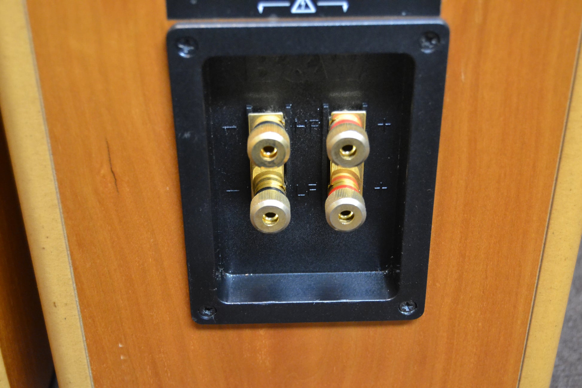 The tweeter reminds me of the top-mounted tweeter on JA's Silver Siggies and my original DM7s. It's not top-mounted, actually. The cabinet slopes back starting about 3½" from the top, and the tweeter (protected under a clear wire mesh) juts out. The effect is unusual, striking, elegant, and allows the tweeter to sound open and airy.