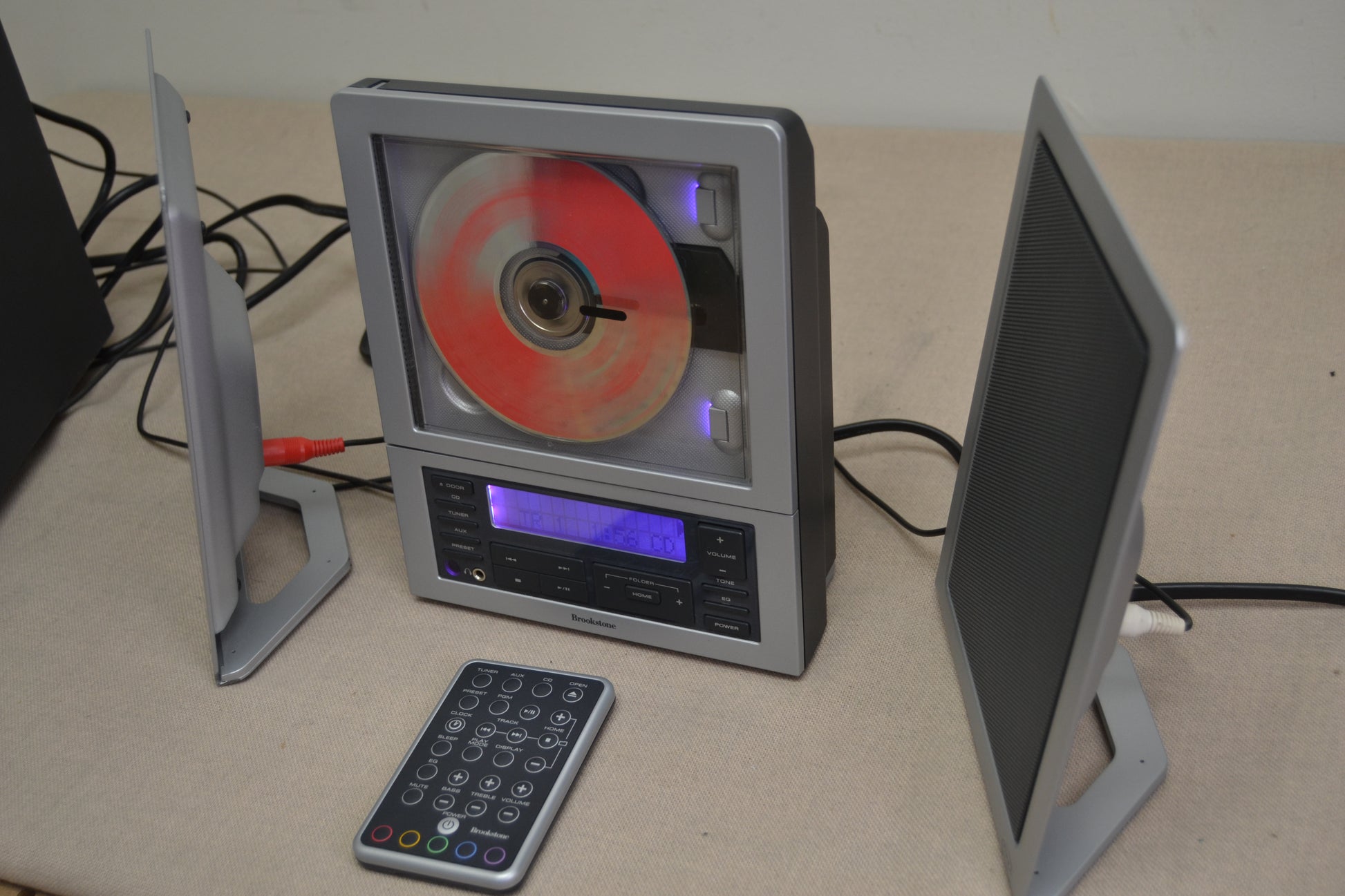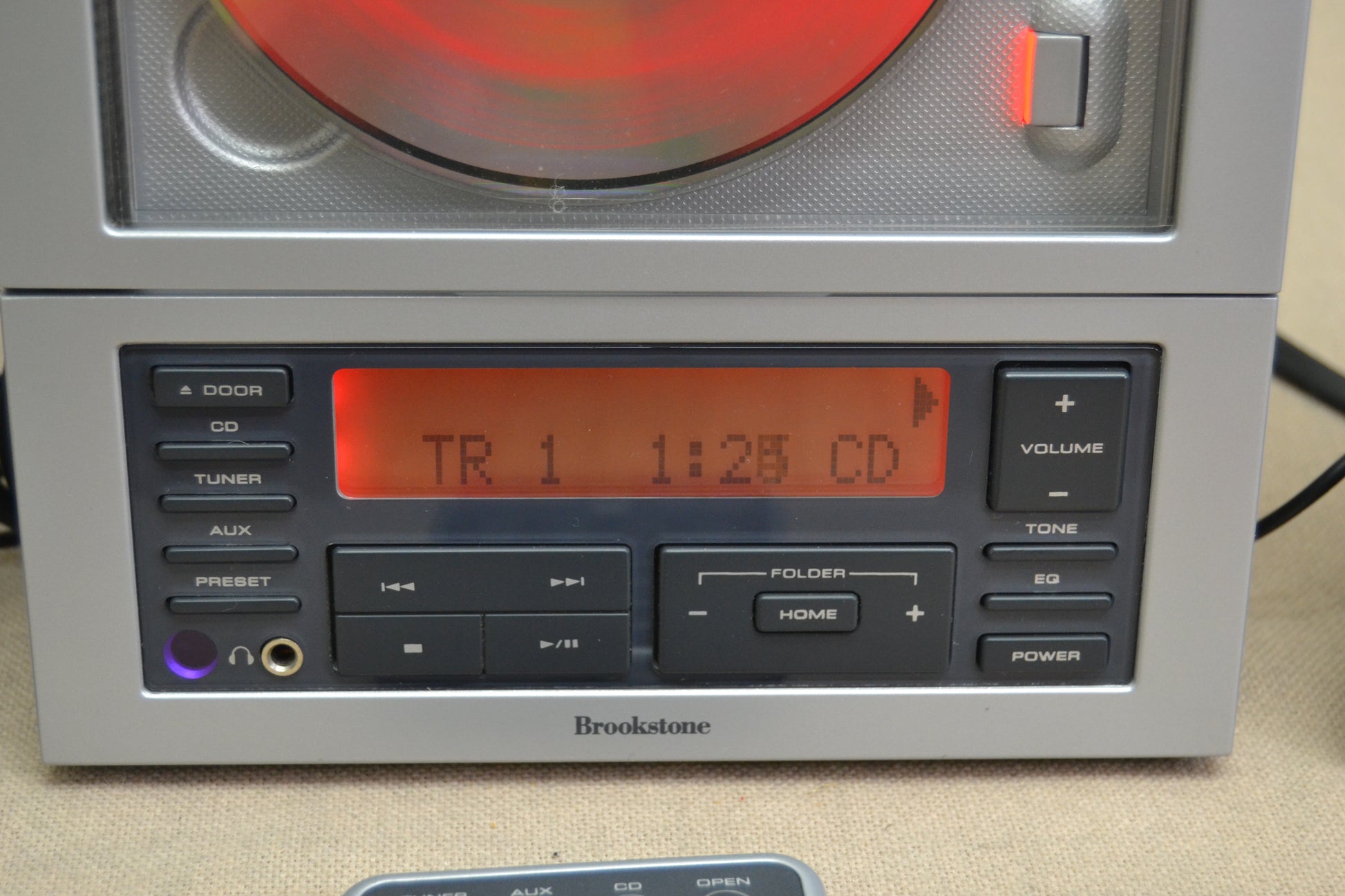 Use of the system is straightforward, though you'll likely have to refer to the manual to set the clock or save F M presets (I'm not going to spoil the fun by including instructions here.) To play a CD simply turn the unit on, press the 'door' button on the unit (or 'open' on the remote) and insert a CD. Pressing 'Play' starts playback and you can adjust volume accordingly. There is no separate subwoofer volume control, since the speakers are powered and crossed over through that module, however tone controls are provided. If you are locating the system in a place that provides too much bass response this may help alleviate major peak problems. If you want a non-linear EQ'ed sound, Brookstone also offers some preset tone settings for Rock , Pop , Jazz , and Flat . You would think we preferred the Flat setting, but I have to admit, the top and bottom gain offered by the Rock setting actually sounded better on some albums in terms of pure enjoyment.