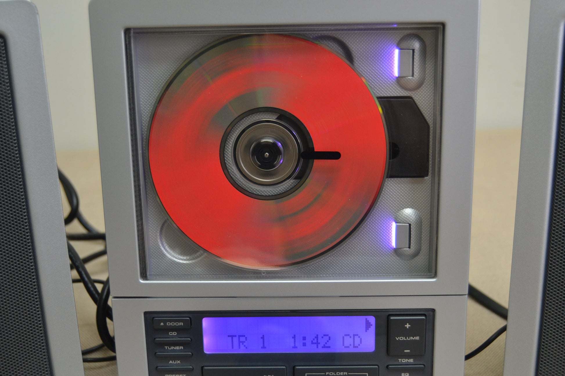 Aside from the flat panel speakers, what makes the system stand out as an attractive "executive" stereo system is the use of multicolor LED backlight options, available in red, blue, green, purple and orange. I suppose you could set the Wafer-thin system to match your mood (though I can't remember the last time I felt 'purple'.) The vertical CD/ MP3 drive orientation, with a mechanically-activated sliding door is also a nice touch and really gives the player a high-end feel.