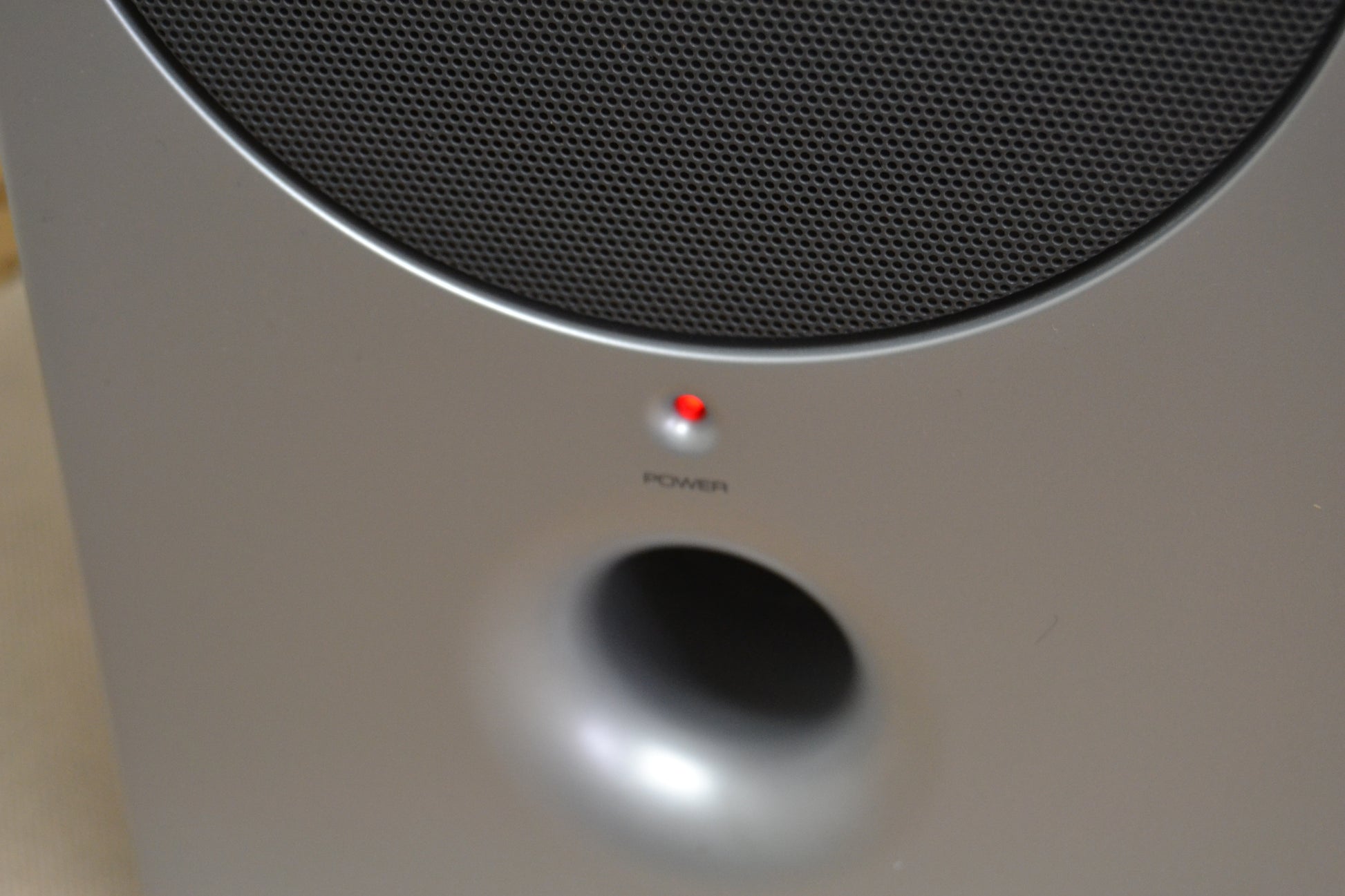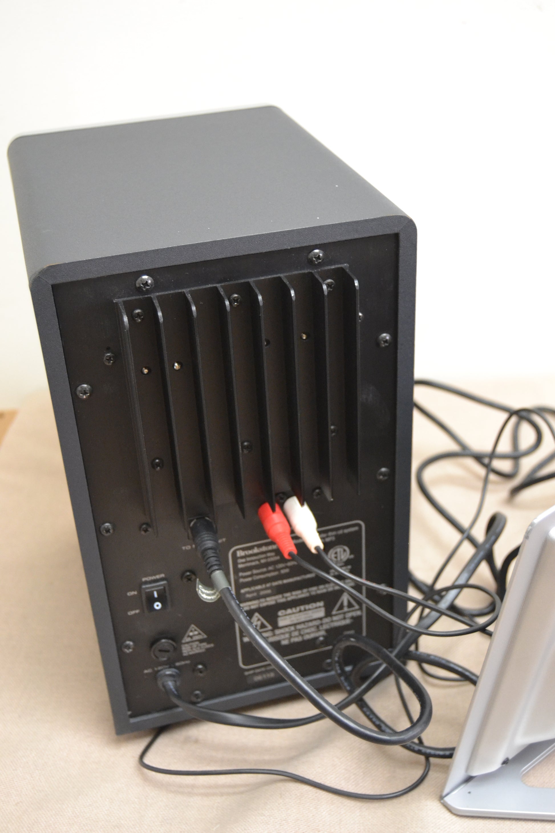 The subwoofer has a 5" paper cone driver and has an effective frequency response down to 60Hz. We opened up the sub and found it to be fairly well braced, though lacking any dampening material. The single port was flared on the inside - a detail often left out in mini systems. The amplifier looked to be well-designed with a large transformer and good quality wiring. This sub should have no problem providing the 33 watts it is rated to deliver.