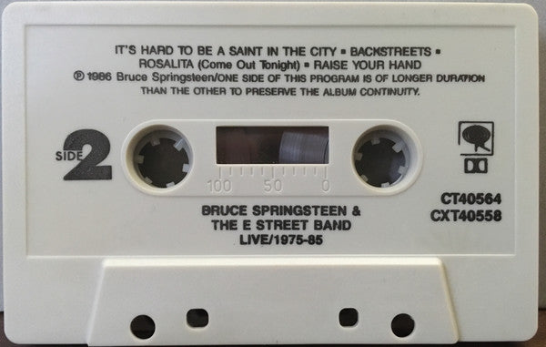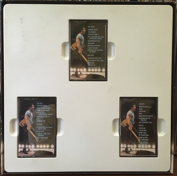 Issued with 36-page full-size Booklet that includes Lyrics, Credits, Etc. Same as Canadian release, but tapes are not CrO2 Cassette Tapes are also white with smooth cassette shells. Similar version with 'textured' cassette shells here - [r5749086 Performance locations & dates: Arizona State University, 11/5/80 - C6 Giants Stadium, 8/19/85 - D4, E6, F2, F5 Giants Stadium, 8/21/85 - F3 Los Angeles Coliseum, 9/30/85 - E1 to E5, E7, F1, F4 Meadowlands Arena, 7/6/81 - C5, D1 Meadowlands Arena, 7/8/81 - C2, C3, C8 Meadowlands Arena, 7/9/81 - F8 Meadowlands Arena, 8/19/84 - D5 Meadowlands Arena, 8/20/84 - F7 Meadowlands Arena, 8/6/84 - D3, F6 Nassau Coliseum, 12/28/80 - C1, C7, D2 Nassau Coliseum, 12/29/80 - C4, C9 Nassau Coliseum, 12/31/80 - A4 Roxy, 10/18/75 - A1 Roxy, 7/7/78 - A2, A3, A5, A7, B1 to B4 Winterland, 12/16/78 - A6