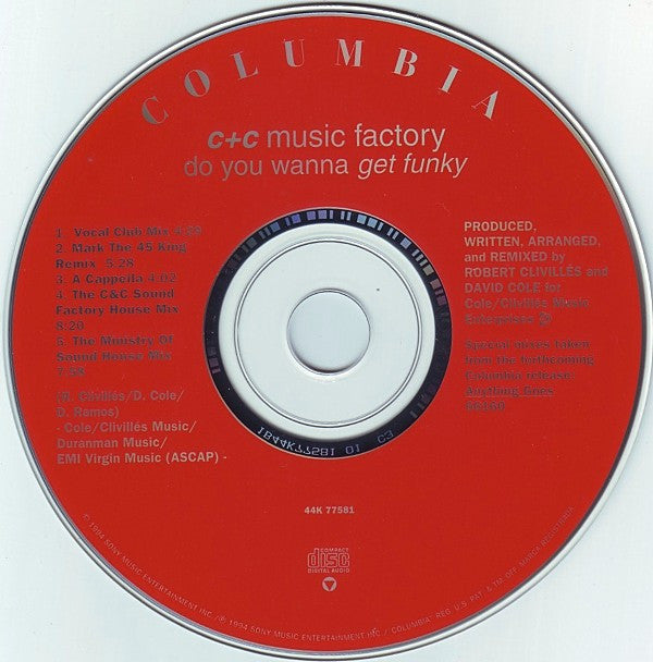[Published by Cole/Clivillés Music / Duranman Music / EMI Virgin Music (ASCAP) Produced, written, arranged and remixed for Cole/Clivillés Enterprises. Mastered at Hit Factory Mastering. [a126128 appears courtesy of Done Deal Management. "Do You Wanna Get Funky": material performed by Nice And Smooth “150254" under license from Rush Associated Labels, published by Screen Gems-EMI Music Inc. (BMI) and Nice N Smooth Music. Special mixes taken from the forthcoming Columbia release: “78025" 66160. On inlay: © 1994 Sony Music Entertainment Inc. / ℗ 1994 Sony Music Entertainment Inc. / Manufactured by Columbia Records. On insert: © 1994 Sony Music Entertainment Inc. On disc: © 1994 Sony Music Entertainment Inc. ℗ 1994 Sony Music Entertainment Inc. The release is housed in a standard jewel case with front and rear inserts.