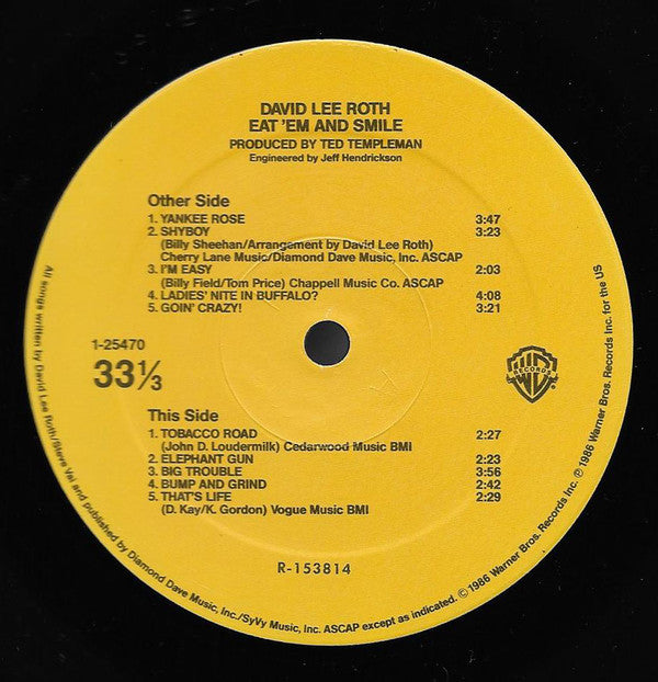 This is the RCA Music Service record club pressing. Issued with custom printed inner-sleeve with credits, additional photos, etc. Recorded at The Power Station, New York and Fantasy Studios, Berkeley, California Additional Recording: Can-Am Recorders, Tarzana, California Originally Mastered at Masterdisk, New York All songs published by Diamond Dave Music, Inc./SyVy Music Inc. ASCAP except A2 published by Cherry Lane Music/Diamond Dave Music, Inc. ASCAP A3 published by Chappell Music Co. ASCAP B1 published by Cedarwood Music BMI B5 published by Vogue Music BMI Cat # 1-25470 appears on the label. Cat # 9 25470-1 appears on the spine and inner sleeve, bottom-right. R-153814 on label. No Barcode. Manufacured by RCA on back of cover.