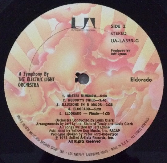 ℗ © 1974 United Artists Records, Inc. All songs © 1974 Jeff Lynne Music Ltd. / Carlin Music Corp. All Disc Pressing (22) with variant center labels include, but not limited to, consentric ring, typeset, (–) between titles/times rather than (•) Custom inner sleeve contains lyrics/credits/photo ELO T-shirt order form insert Recorded at De Lane Lea Studios, London