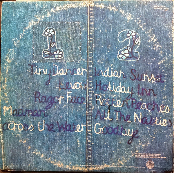 [l314985 pressing released with a gatefold cover, housed inside is a 6 page photo booklet (MCA re-branded) glued to inner right panel. Cover is a standard glossy cover. All selections previously released on UNI album old number 93120 entitled MAD MAN ACROSS THE WATER © MCA Records, Inc. 1971 All songs © 1971Dick James Music Ltd. London except A4, B2 © 1970 Publisher: Dick James Music, Inc. BMI [a344807 courtesy of Vertigo Records B.J. Cole courtesy of [l4898 [a149420 courtesy of [l125796 Leslie Duncan courtesy of [l19936 [a261930 courtesy of Harvest Records [a461260 courtesy of [l25407 [a356030 courtesy of [l93330