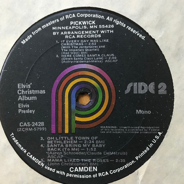 Canadian Mono Reissue on Pickwick housed in a Stereo jacket (mono stickers were on the plastic wrapping). Previously released on Camden Records. Made from masters of RCA Corporation. All rights reserved. A Product of Pickwick International, Inc., Woodbury, N.Y. 11797 WARNING: Unauthorized reproduction of this recording is prohibited by Federal Law and subject to criminal prosecution. TMK(S) Registered . Marca(s) Registrada(s) RCA Corporation (c) 1970, RCA Records, New York, N.Y. Trademark CAMDEN used with permission of RCA Corporation.