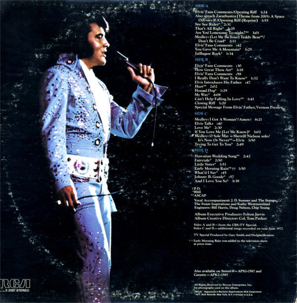 Original US pressing with gatefold sleeve and blue RCA labels. Some copies included a 4-page "Elvis' New Albums" insert and a "Reservation Certificate". Some copies have a gold stamp on back cover: "Demonstration - Not For Sale".
