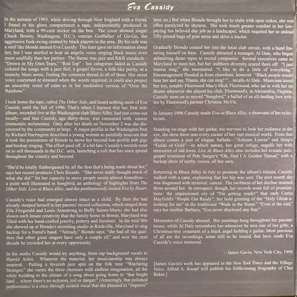 Live At Blues Alley recorded live Jan. 2 & 3, 1996 (except: "Oh, Had I A Golden Thread" recorded at Chris Biondo's) Tracks A1, A3 & B3 from "Live At Blues Alley" Tracks A2, A4, A5, B1, B2 & B4 "from Eva By Heart" Track B5 from "The Other Side" A1: EMI Blackwood Music - BMI A3: Morley Music Co. and Enoch et cie ASCAP A5: Fleetwood Mac Music - BMI B1: Dwyer Hills Music / PSO Limited - ASCAP B2: PSO Limited / Eve Songs Inc. / Dwyer Hills Music - ASCAP B3: Warner Tamerlane - BMI B4: Stormking Music, Inc. - ASCAP B5: EMI Feist Catalog, Inc. - ASCAP Licensed by Blix Street Records, Inc. from Barbara anh Hugh Cassidy. ℗ 1992, 1996, 1997, 1998, 2003 © 1998, 2003 Lacquers cut at Acoustech Mastering by Steve Hoffman and Kevin Gray. WAVAC amplification from tmhaudio.com HQ-180 ® Registered Trademark, Record Technology Inc. 180+ Pure Virgin Vinyl Analogue Pressing Made in the U.S.A.