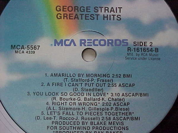 RCA Record Club edtion. ©1985 MCA Records, Inc., ℗1981, 1982, 1983, 1985 MCA Records, Inc. Mastered at Masterfonics using JVC Digital Audio Mastering System. All original analog tapes were transferred to JVC Digital. Manufactured by RCA Music Service under license Produced for Southwind Productions (Side A, Side B 1&2) From the MCA LP, "Strait Country", MCA-27092 (tracks A1, A2, A3) From the MCA LP, "Strait From The Heart", MCA-5320 (tracks A4, A5, B1, B2) From the MCA LP, "Right Or Wrong", MCA-5450 (tracks B3, B4, B5) BMI (tracks A1, A2, A5, B1, B3, B5) SESAC (tracks A2, A5) ASCAP (tracks A3, A4, B2, B3, B4, B5) Personal Transportation Provided by Pipes Chevrolet-Pontiac, Inc., Dilley, Texas.