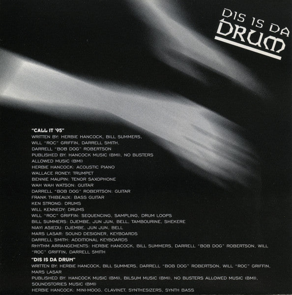 Album recorded at Garage Sale Studios, L.A., CA Additional recording: Studio 55 L.A., CA Track 1: Published by: Hancock Music (BMI), No Busters Allowed Music (BMI) Track 2: Published by: Hancock Music (BMI), Bilsum Music (BMI), No Busters Allowed Music (BMI), Soundstories Music (BMI) Track 3: Publishers: Bilsum Music (BMI), Solimar Too Music (ASCAP), No Busters Allowed Music (BMI) Track 4: Published by: No Busters Allowed Music (BMI) Masomakali Music (BMI), Chil-dream Music (BMI) Track 5: Published by: Hancock Music (BMI), Bilsum Music (BMI), No Busters Allowed Music (BMI), Soundstories Music (BMI), Masomakali Music (BMI) Track 6: Published by: Hancock Music (BMI) Track 7: Published by: Bilsum Music (BMI), Soundstories Music (BMI), No Busters Allowed Music (BMI) Track 8: Published by: Benpin Music (BMI), Blue Horn Productions (BMI), Stank Music/National League Music (ASCAP) Track 9: Published by: Hancock Music (BMI), Wahwatson Music (BMI), Masomakali Music (BMI) Track 10: Published: Hancock Music (BMI), Wahwatson Music (BMI), No Busters Allowed Music (BMI), Bilsum Music (BMI), Soundstories Music (BMI), Masomakali Music (BMI) Track 11: Published by: Hancock Music (BMI), Wahwatson Music (BMI) ℗© 1994 PolyGram Records, Inc. Printed in U.S.A. Made in USA