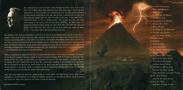 This enhanced audio CD also contains a weblink to additional Lord Of The Rings multi-media content. ©℗ 2003 Reprise Records for the U.S. and WEA International Inc. for the world outside the U.S. The Lord Of The Rings, the characters, names, and places therein, ™The Saul Zaentz Company d/b/a Tolkien Enterprises, under licesnse to New Line Productions, Inc. © 2003 New Line Productions, Inc. Motion Picture Artwork & Photography © 2003 New Line Productions, Inc. © 2003 Reprise Records Manufactured in the E.U.