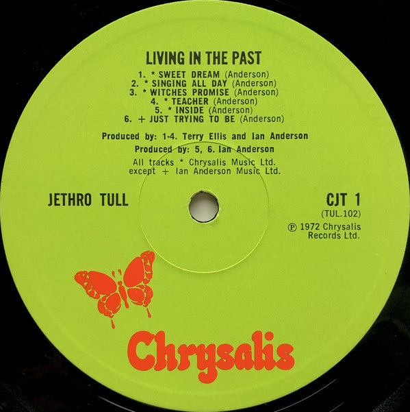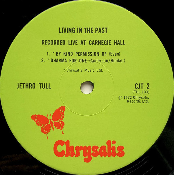 Note that this is very similar to [r=5136909. The only difference is found on labels which have (TUL.101/2/3/4) with parentheses, whereas the other version has TUL.101/2/3/4 without parentheses. Original UK press released with the green Chrysalis labels. Released in a leather effect gatefold sleeve with 22 page booklet stapled to the inside. Pages 5 & 6 and pages 19 & 20 are sealed together on three sides to provide a pouch for the records. Made and printed by The Cavendish Press Ltd., Leicester. Cat# CJT1 appears on spine of sleeve ℗1972 (Note that on the US version track B5 is "Alive and Well and Living In" and track D2 is "Hymn 43".)