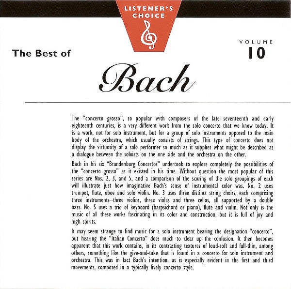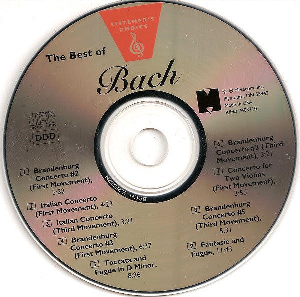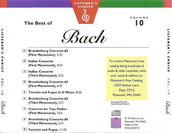 Metacom proudly presents "The Best of Bach", Volume #10 of ten volumes from the Listener's Choice Classical Music Series. Expertly selected from thousands of musical pieces, this collection is one of the world's greatest classical anthologies available. All volumes have been digitally recorded in stereo to bring you the best state of the art sound. Each selection is performed by an outstanding world class orchestra to bring you years of listening pleasure. Sit back, relax, and enjoy the magic of our Listener's Choice "The Best of Bach". Made in USA Cat# on back: R/M# 0303710 Cat# on booklet: R/M# 0403710 Cat# on CD: R/M# 7403710
