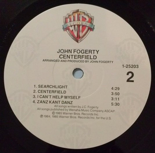 ℗ 1984, 1985 Warner Bros. Records Inc. © 1985 Warner Bros. Records Inc. All songs © 1984 Wenaha Music Company Original Allied Pressing before track B4 "Zanz Kant Danz" was changed Custom inner sleeve contains lyrics/credits/photo Recorded at The Plant Studios, Sausalito, CA J. Fogerty played all instruments on this album with overdubbing Dedicated to Gossimer Wump