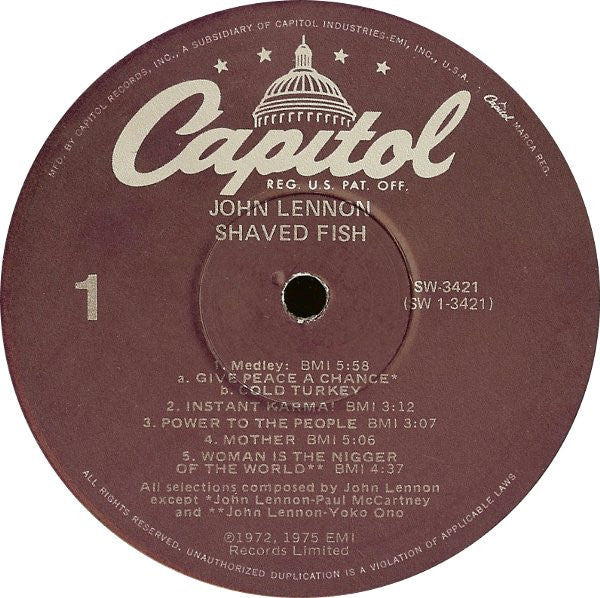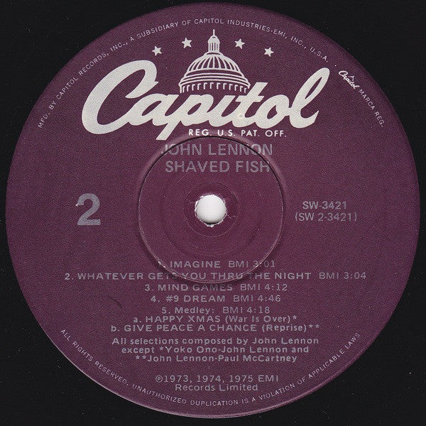 "A conspiracy of silence speaks louder than words" - Dr. Winston O'Boogie A1a Recorded in Room 1742, Montreal, Canada A1a (Bag) All titles Maclen Music, Inc. EXCEPT A5: Ono Music, Inc. also claimed by Maclen Music, Inc./Northern Songs B1 to B3: Lennon Music/ATV Music Corp. B5a: Ono Music, Inc./Maclen Music, Inc Ⓟ1972, 1973, 1974, 1975 EMI Records Limited Manufactured by Apple Records, Inc. Printed In U.S.A. A1a & A1b Copyright ©1969 Maclen Music, Inc./BMI A3, A5 Copyright ©1970 Maclen Music, Inc./BMI A4, B1 Copyright ©1971 Maclen Music, Inc./BMI A5 Copyright ©1972 Ono Music, Inc. also claimed by Maclen Music, Inc./Northern Songs/BMI B2, B4 Copyright ©1974 Lennon Music/ATV Music Corp./BMI B3 Copyright ©1973 Lennon Music/ATV Music Corp./BMI B5a Copyright ©1972 Ono Music, Inc./Maclen Music, Inc./BMI Mfg. By Capitol Records, Inc., A Subsidiary Of Capitol Industries-EMI, Inc., U.S.A. Includes printed red-and-white inner sleeve with lyrics.