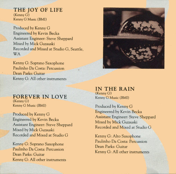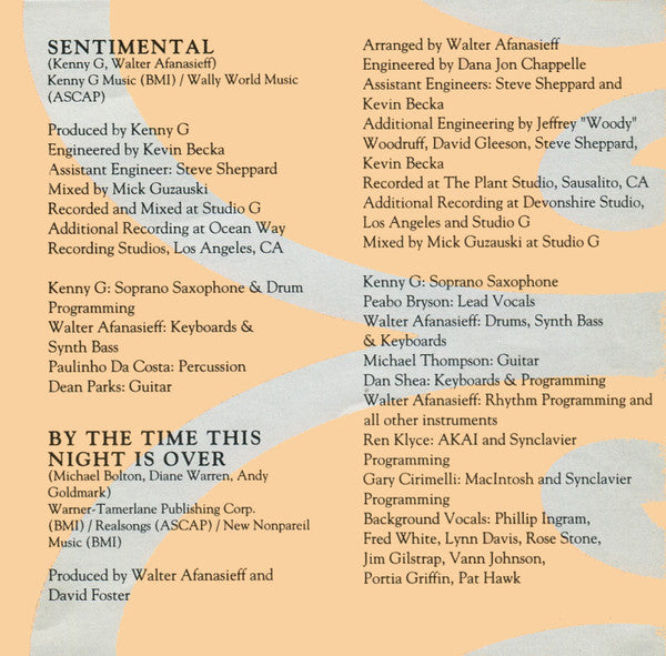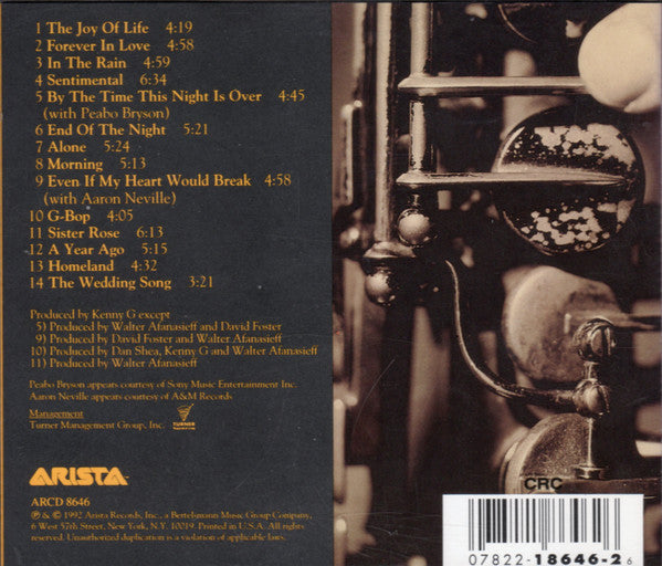 This is a club version denoted by CRC above barcode on back of tray card. Peabo Bryson appears courtesy of Sony Music Entertainment Inc. Aaron Neville appears courtesy of A&M Records. (P)&(C) 1992 Arista Records, Inc., a Bertelsmann Music Group Company 1 to 4, 6 to 8, 12 & 13 - Recorded and Mixed at Studio G, Seattle, WA. 4 & 8 - Additional Recording at Ocean Way Recording Studios, Los Angeles, CA. 5 - Recorded at The Plant Studio, Sausalito, CA. Additional Recording at Devonshire Studio, Los Angeles and Studio G. Mixed at Studio G. 9 - Recorded at Village Recorders, Los Angeles. Additional Recording at The Plant, The Hit Factory, New York, Studio G. Mixed at Studio G. 10 & 11 - Recorded at Studio G and The Plant. Mixed at Studio G. 14 - Recorded at Ocean Way. Mixed at Studio G. Publishing: 1 to 3, 6, 7, 12 & 13 - Kenny G Music (BMI) 4, 8, 11 & 14 - Kenny G Music (BMI) / Wally World Music (ASCAP) 5 - Warner-Tamerlane Publishing Corp. (BMI) / Realsongs (ASCAP) / New Nonpareil Music (BMI) 9 - EMI Virgin Songs, Inc. / Chesca Tunes (BMI) / WB Music Corp., Adrian Gurvitz Music (ASCAP) 10 - Picnic Hill Music / Kenny G Music (BMI) / Wally World Music (ASCAP)