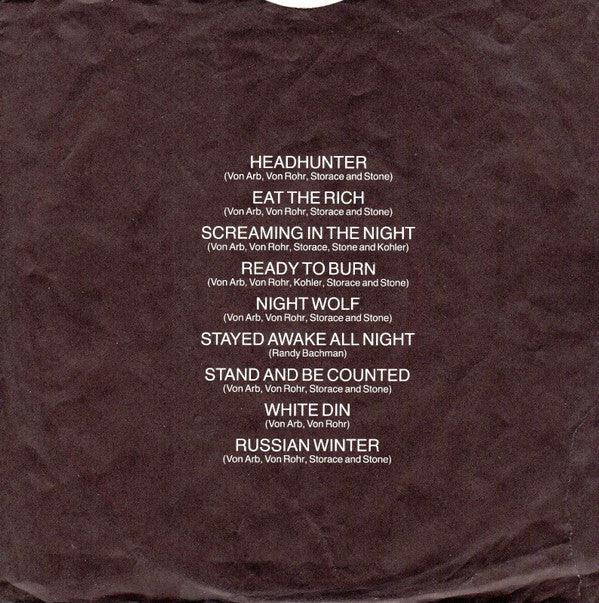Inner sleeve: Special thanks to the following people for additional background vocals: Rob Halford of Judas Priest appears through courtesy of CBS Records. Jimi Jamison of Cobra appears through courtesy of Epic Records. The Mad Monks of Murmansk.