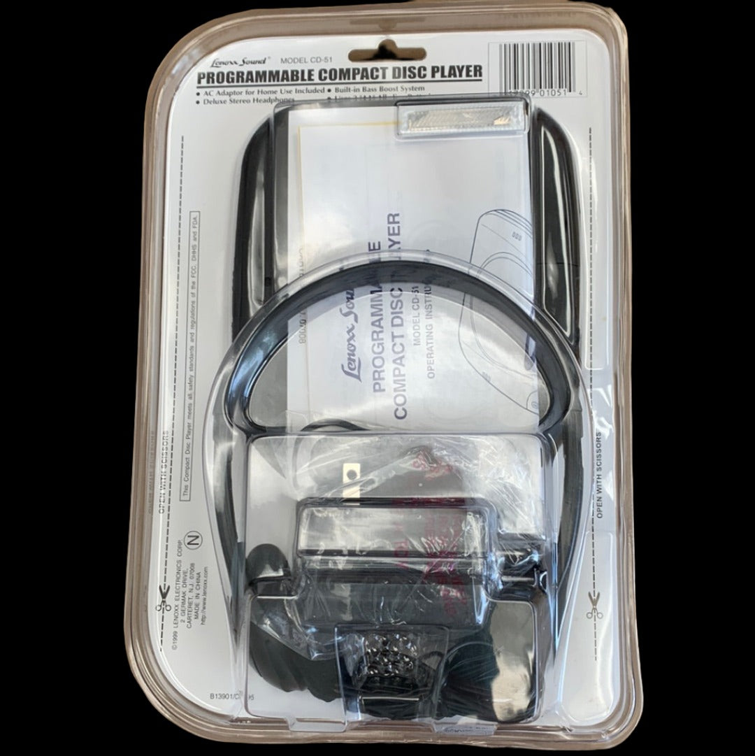 Item is unopened and dated 1999. Headphones and instructions are included. The Lenoxx Sound CD-51 is a portable, LCD CD player with a 1-bit DAC and bass boost.