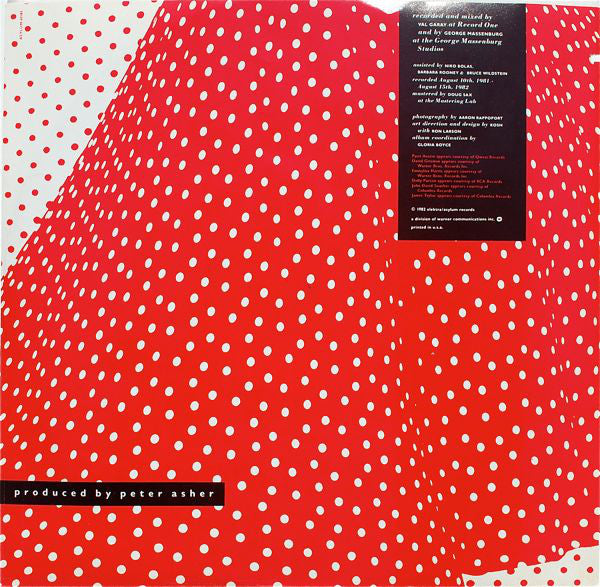 Track B5 recorded June, 3rd. 1977 Track B6 produced in January, 18th. 1978 Recorded and mixed at George Massenburg Studios between August 10th. 1981 - August 15th. 1982 Mastered at the Mastering Lab 1st cat # appears on center label. 2nd cat # appears on spine. 3rd cat # appears on rear sleeve. Variations for Var. 5: An "E A S T" embossed around the center hole of Side B indicates it was pressed at Specialty Records Corporation using metal parts that were originally made for use at Allied Record Company based on the etchings.