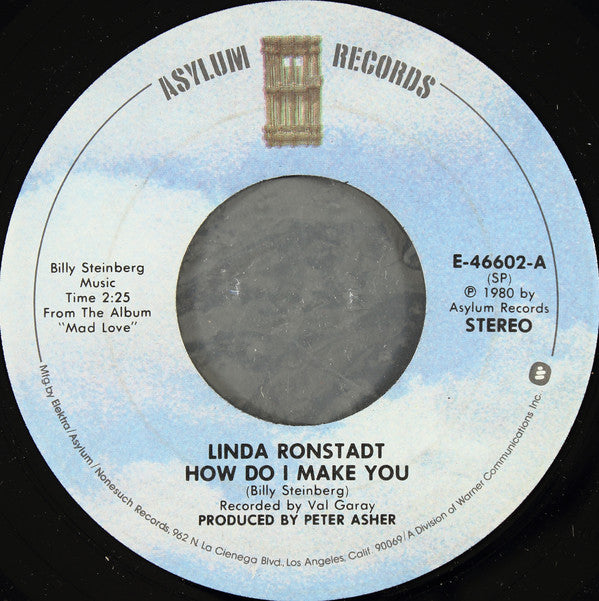 Picture sleeve variation of Specialty pressing. Company sleeve is [r14330937 Label-factory variant, vinyl pressing (Specialty, SP on the labels and/or SRC logo stamped in the run-outs) Side A: From The Album "Mad Love", and is an edit of the album version Side B is P.D. and was issued as a non-album track ℗ & © 1980 Elektra/Asylum Records Printed in U.S.A.