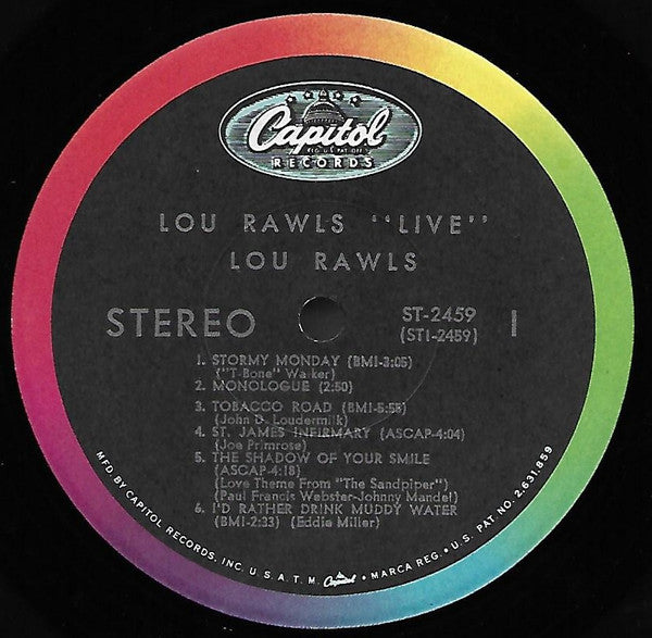 Label variation from this pressing including but not limited to tracks A2 and B5 being listed as Monologue without writing credits on labels. Catalog number ST 2459 appears on spine, front and back cover. Catalog appears as ST-2459 on labels. Side 1 Announcements: Jay Rich of Radio Station KBCA. Side 2 Announcements: Johnny Magnus of Radio Station KMPC. Runouts are stamped except #2