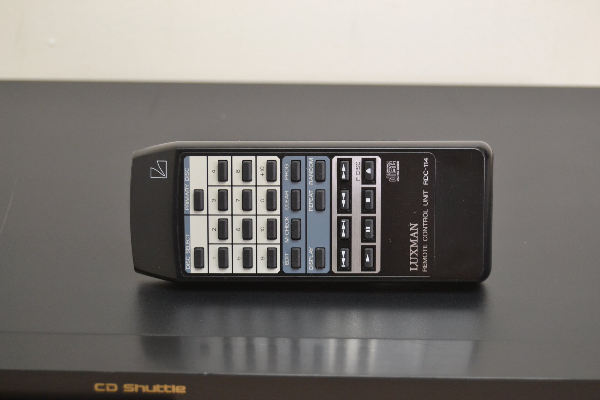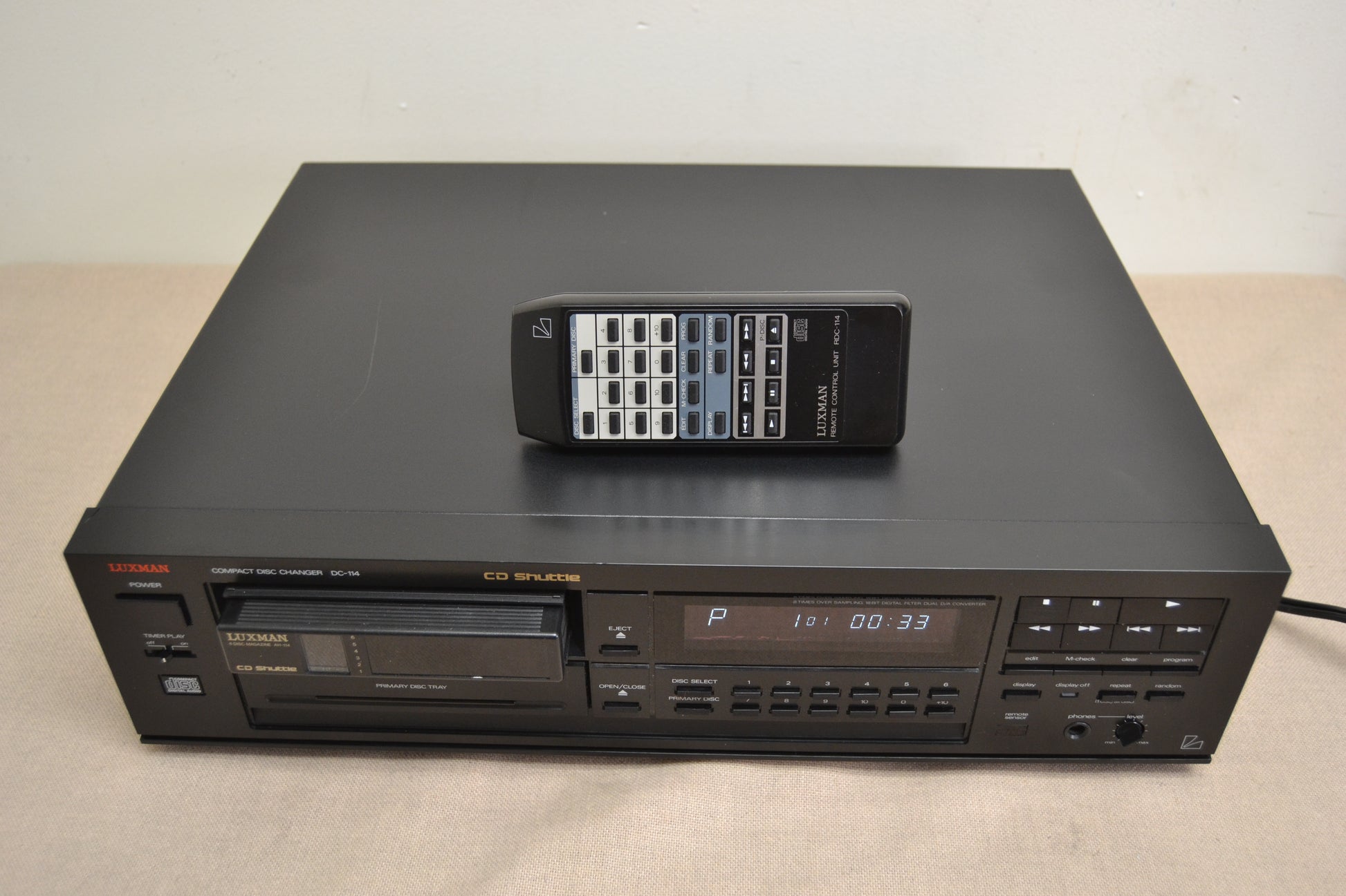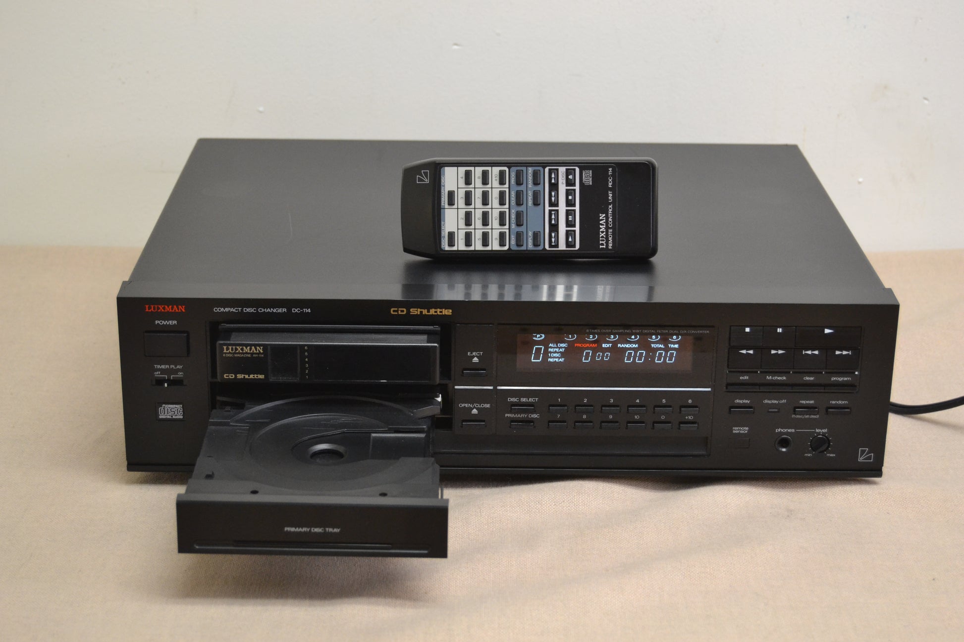 The Luxman DC-114 is an early-1990s 6-disc magazine-style home CD changer that also features a single-disc slot for quick, interruption-free playback. Key features include proprietary Duo-Beta circuitry for improved audio quality, compatibility with Alpine 5952 car changer cartridges, and a remote-controlled black metal chassis