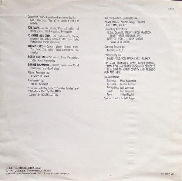 Flip-top "unipak" styled cover, LP housed in sleeve with artwork of band members and credits. Conceived, written, produced and recorded in San Francisco, Sausalito, London, and Los Angeles. Track B2 Published by Blue Flame Publishing; all others Almo Music