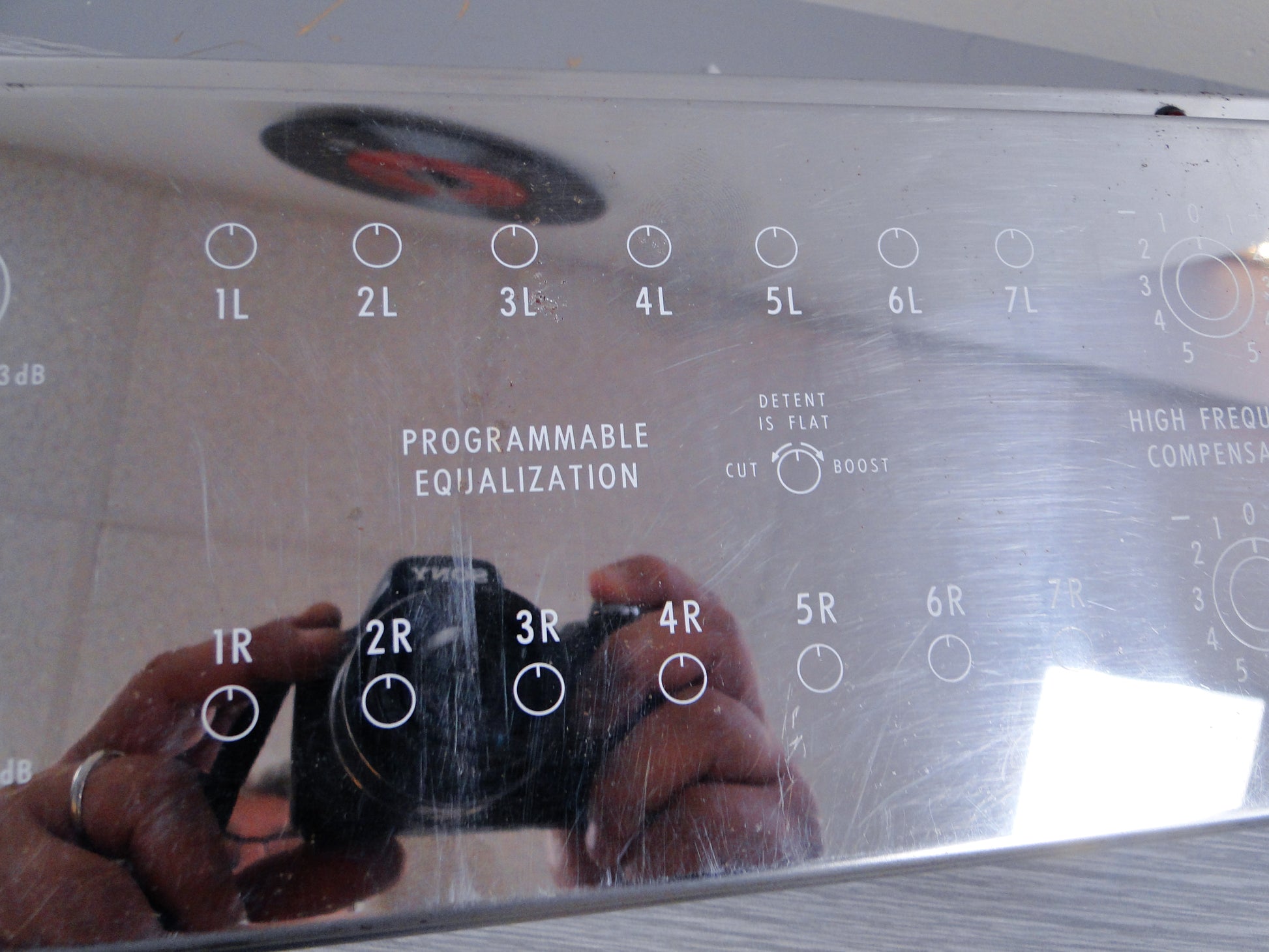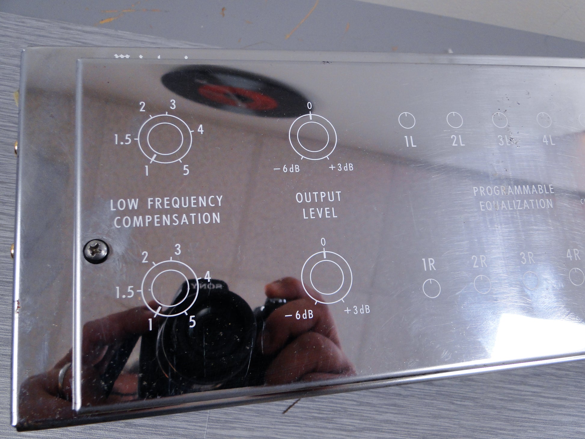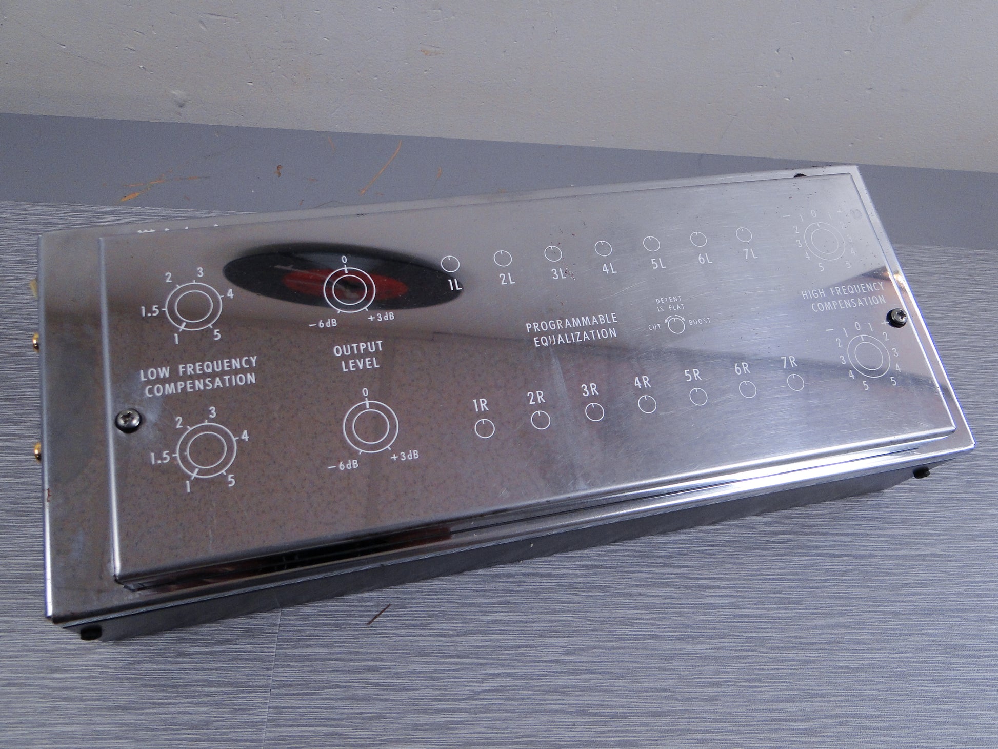 It has variable LOW FREQUENCY COMPENSATION, which is bass boost peaking at 20 Hz, seven programmable bands of semi-parametric EQ, a HIGH FREQUENCY COMPENSATION (treble) control and gain trim for each channel.