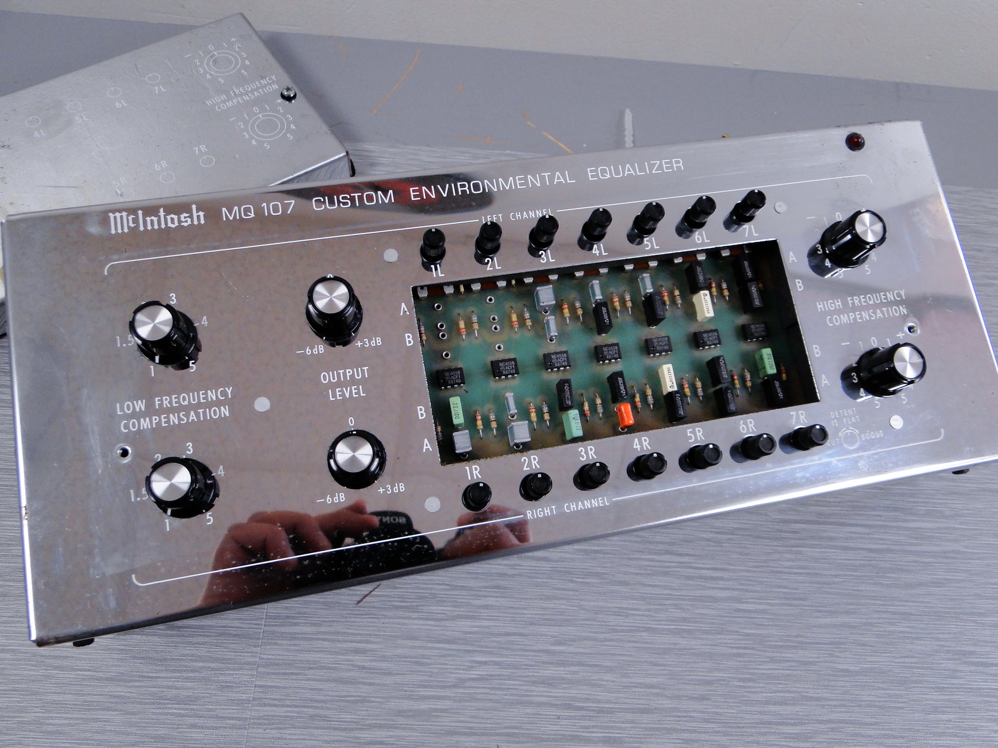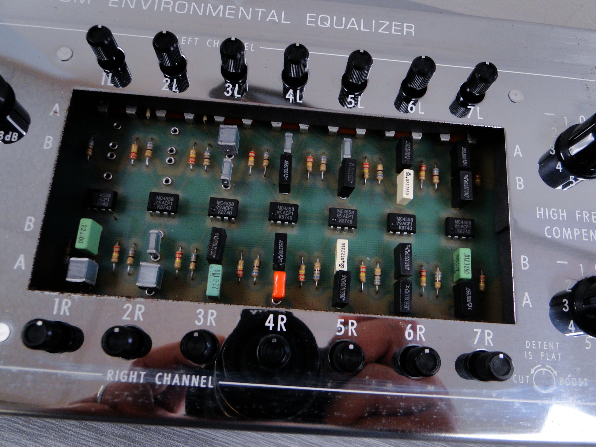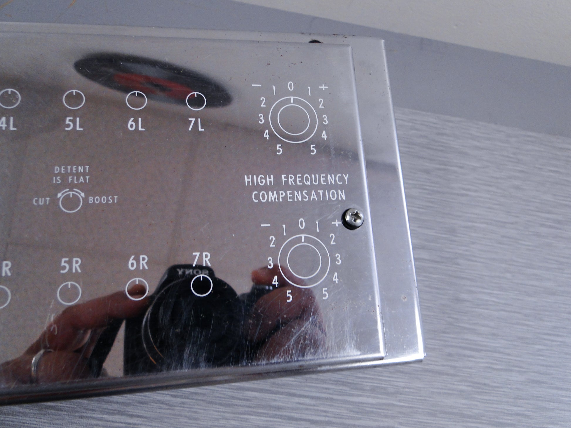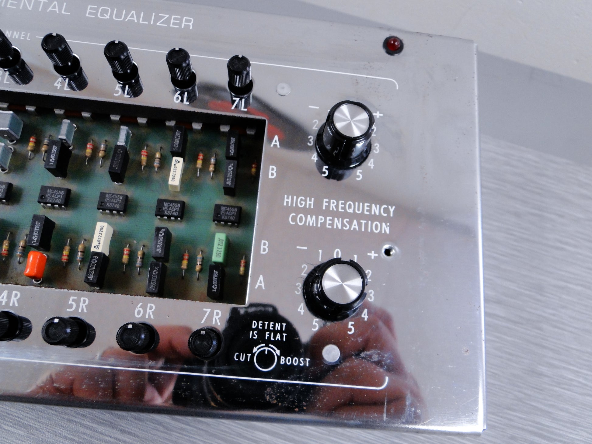 It has variable LOW FREQUENCY COMPENSATION, which is bass boost peaking at 20 Hz, seven programmable bands of semi-parametric EQ, a HIGH FREQUENCY COMPENSATION (treble) control and gain trim for each channel.
