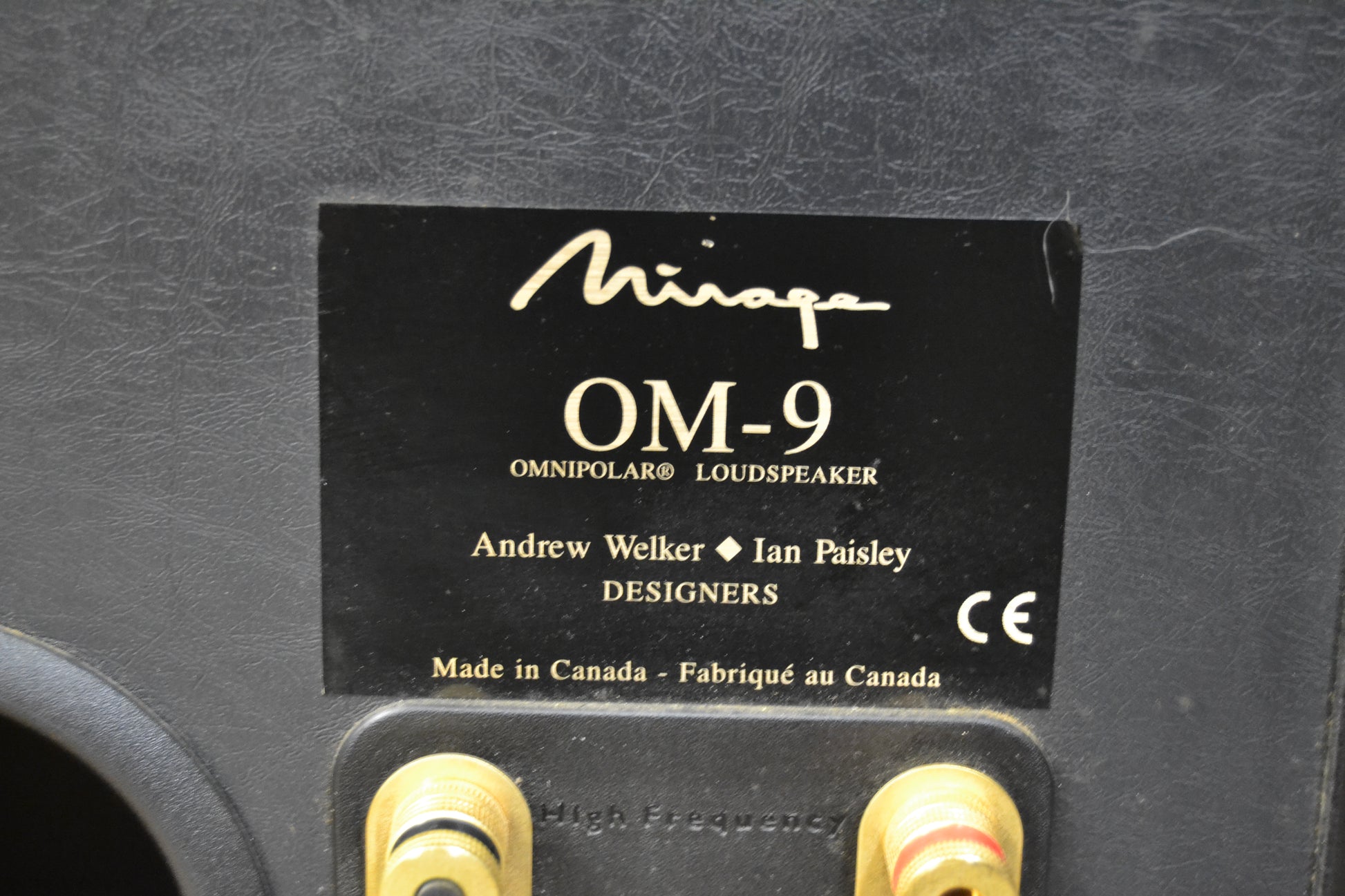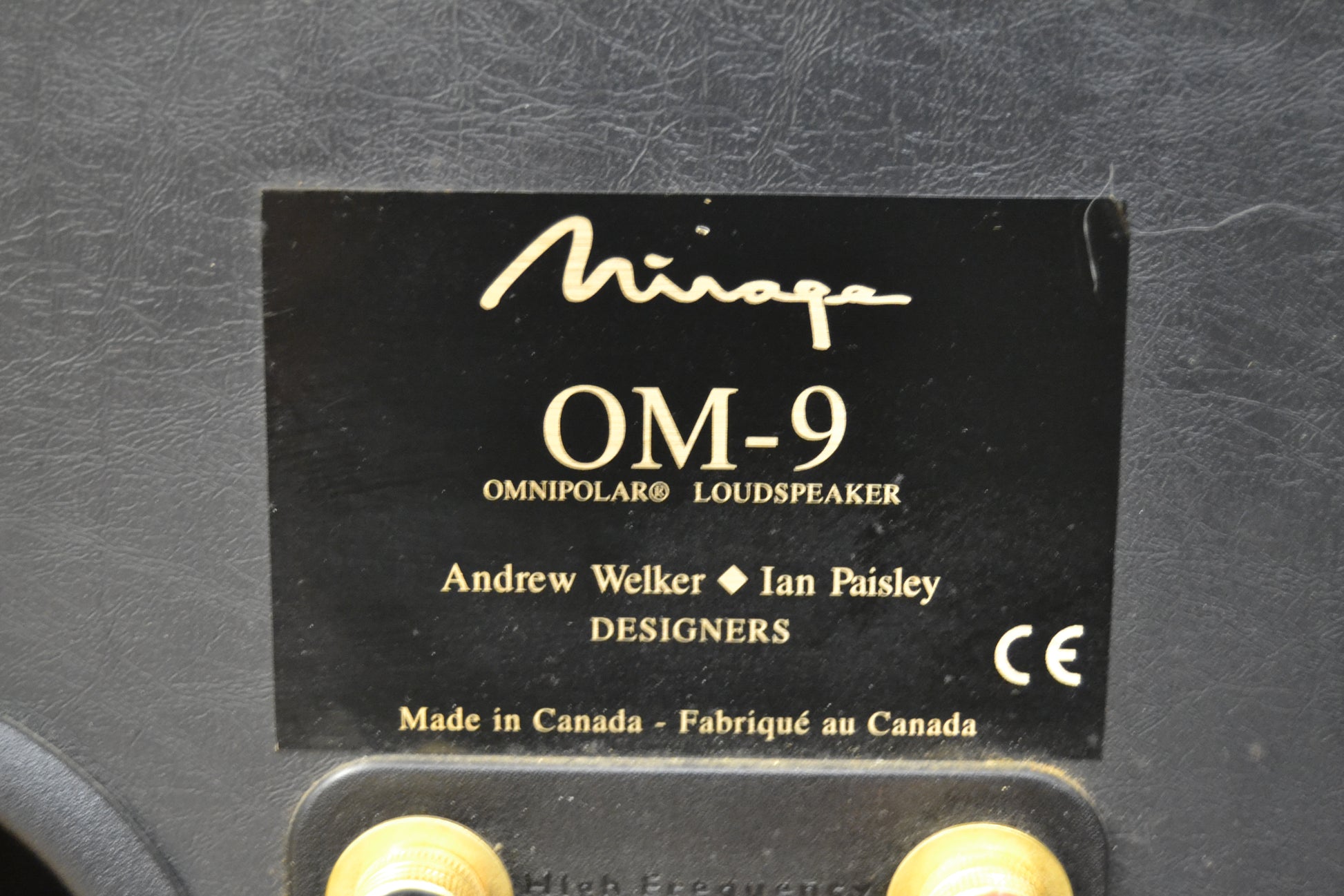 The Mirage OM-9 is a 2-way, omnipolar tower speaker designed for a 360-degree sound dispersion pattern, using both front and rear drivers to direct sound toward the listener and room boundaries for a natural, realistic sound. Key specifications include two drivers (a 1" tweeter and a 6.5" woofer) on both the front and rear baffles, a 43.75" height, a 90dB room efficiency, and a nominal 8-ohm, 4-ohm minimum impedance. The design features a unique wedge-shaped profile and supports bi-wiring due to its widely spaced, high-quality binding posts.