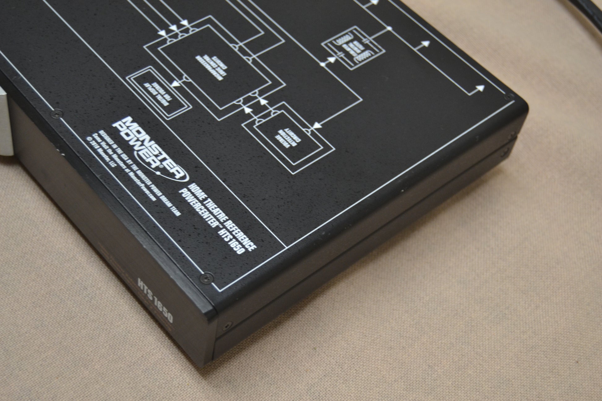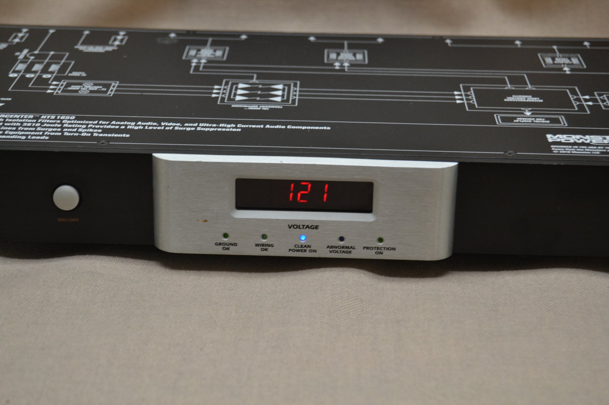 The Monster Power HTS-1650 provides surge protection for home theater systems with over 5,526 joules of capacity, Triple-Layer Surge Protection (on line, neutral, and ground), and features a digital voltage meter, Clean Power Stage 2 v.2.1 noise filtering, and Tri-Mode power protection. It includes eight color-coded outlets, coaxial and network connectors, and surge-protected phone jacks with a splitter.