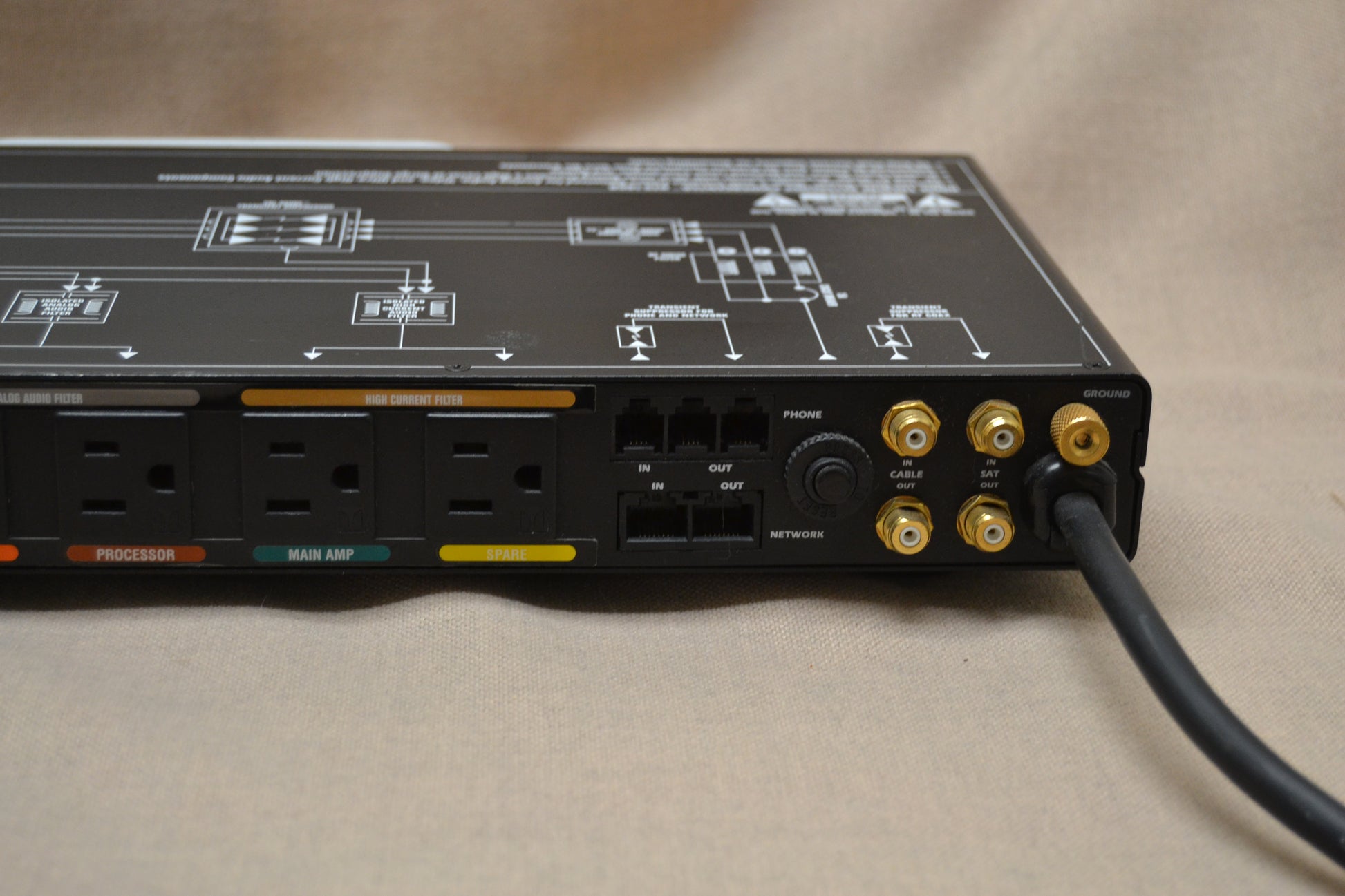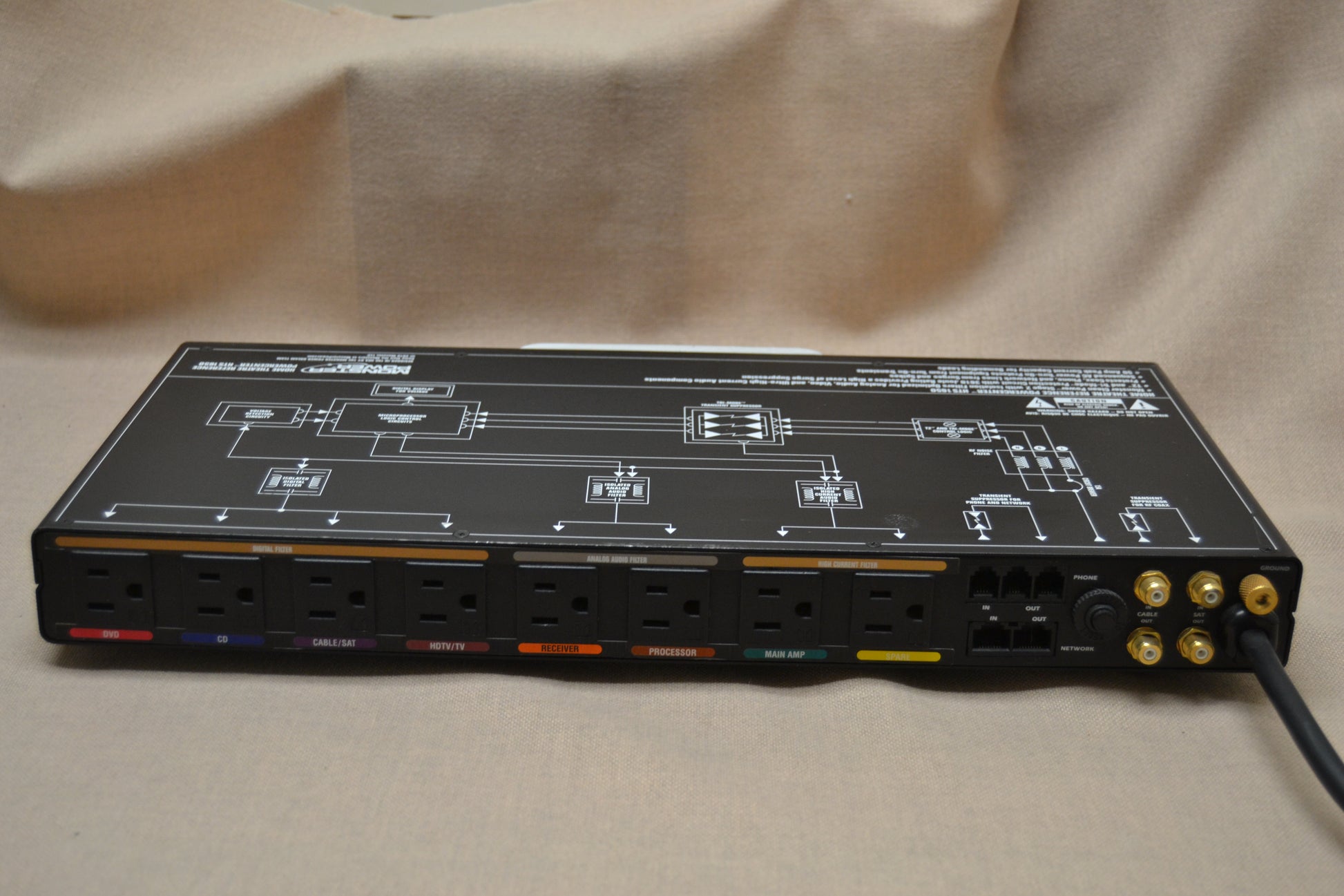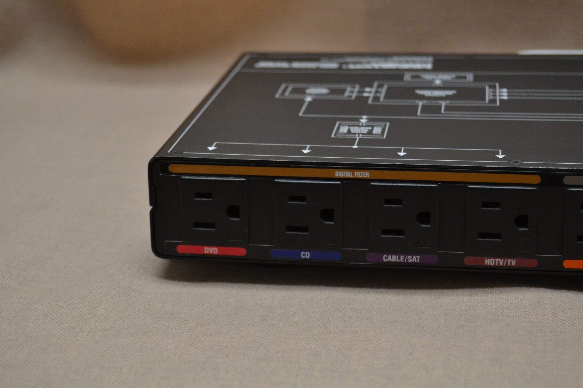 AC Outlets: Eight surge-protected, color-coded outlets for home theater components.