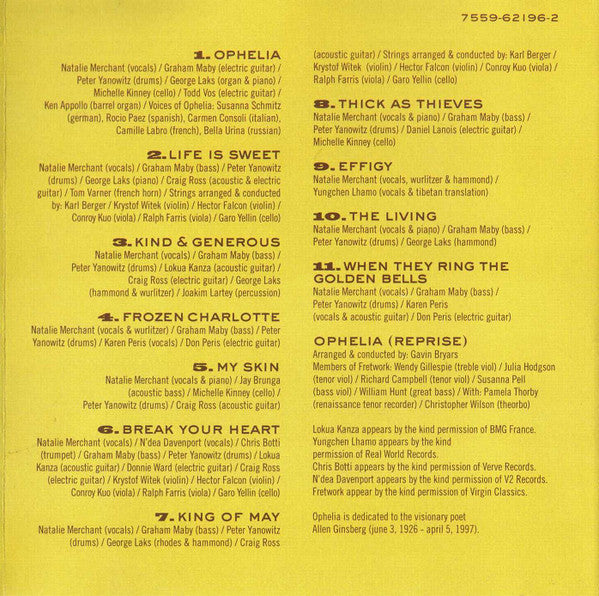 ℗© 1998 Elektra Entertainment Group, a division of Warner Communications Inc. for the United States and WEA International Inc. for the world outside of the United States. Made in Germany by Warner Music Manufacturing Europe CD: Made In Germany All songs written by Natalie Merchant except When They Ring The Golden Bells by Dion de Marbelle 1887 (Public Domain). Track 11.3 is unlisted but Ophelia (Reprise) is referred to separately in the credits (track time from CD player)