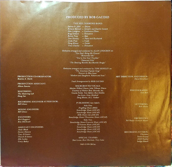 A1: (Vocal at 1:48) Recording Studios: Cherokee, Sunset Sound, A&M Studios, Indigo Ranch Publishing: A1: FrogKing Music (BMI) A2, A3, B3, B4, B5: Stonebridge Music (ASCAP) A4: Mills Music Ltd. (ASCAP) A5: Stonebridge Music / Threesome Music (ASCAP) B1: Stonebridge Music / Concerto Music (ASCAP) B2: All Seasons Music (ASCAP) [labels ℗ 1978 CBS Inc. Printed in U.S.A. [sleeve © 1978 CBS Inc./℗ 1978 CBS Inc. Manufactured by Columbia Records/CBS Inc. Catalog #FC 35625 appears on spine and labels; 35625 appears on inner sleeve. Includes printed inner sleeve.
