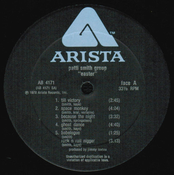 ℗ © 1978 Arista Records, Inc. All text © 1978 Patti Smith [l717172 pressing indicated by "77" etched in run outs coupled with 2.75" press ring. Includes 4 page insert containing lyrics/credits/photos Insert notes: "recorded at the record plant, nyc… and the house of music, west orange nj" AB4171 on back cover and spine AB 4171 on labels ab 4171 on insert