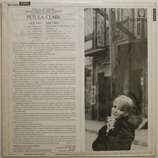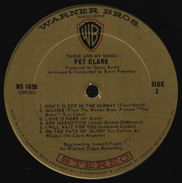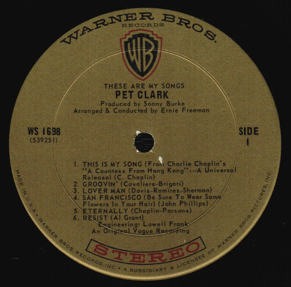 Original issue on gold Warner Bros. label. This pressing has no manufacturing code on back cover, but has a Columbia Pitman "P" stamp in the runout area. A very similar edition, [r=7898335, has no "P" but has a "5" code on the back cover. Customatrix identified by "0" oval stamp in the runout area. Info on sleeve front: AN ORIGINAL VOGUE RECORDING PRINTED IN U.S.A. Info on sleeve reverse: MADE IN U.S.A. AN ORIGINAL VOGUE RECORDING Warner Bros. Records, Inc., a subsidiary and licensee of Warner Bros. Pictures, Inc., 4000 Warner Boulevard, Burbank, California; 321 W. 44th Street, New York, New York.