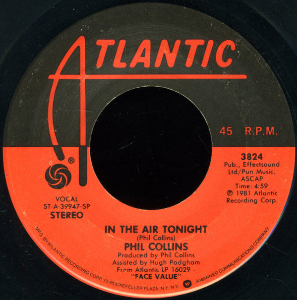 Label-factory variant, vinyl pressing (Specialty, SP on the labels and/or SRC logo stamped in the run-outs) with picture sleeve Although not stated, Side A is a re-mix and edit of the album version. From Atlantic LP 16029 "FACE VALUE" ℗© 1981 Atlantic Recording Corporation Printed in U.S.A.