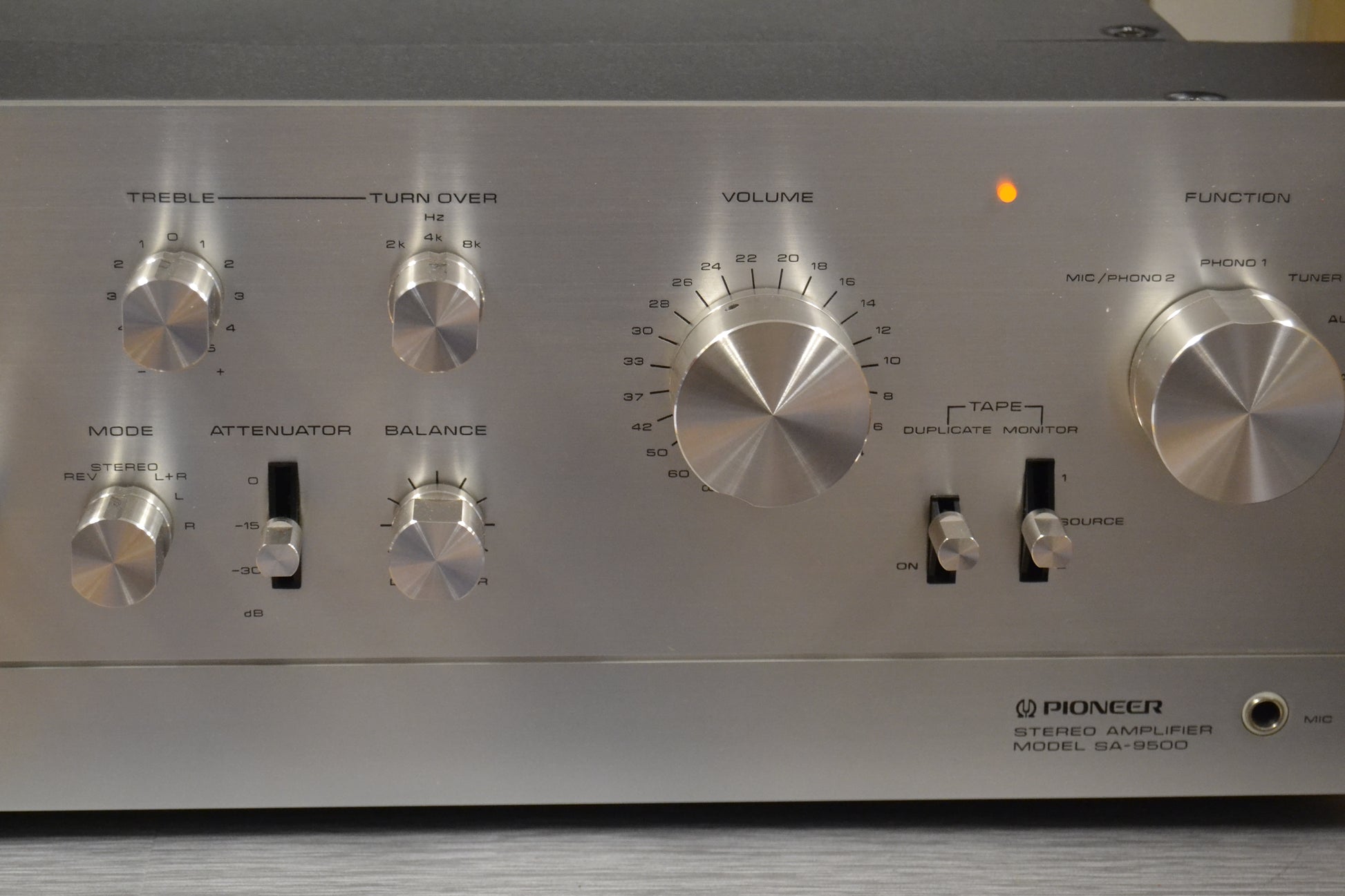The Pioneer SA-9500 does deliver an unusually large continuous power output of 80 watts per channel, min RMS at 8 ohms from 20 Hertz to 20,000 Hertz with no more than 0.1% total harmonic distortion, but it also ensures that even when operated at low volumes the performance retains a crisp, sparkling clarity.